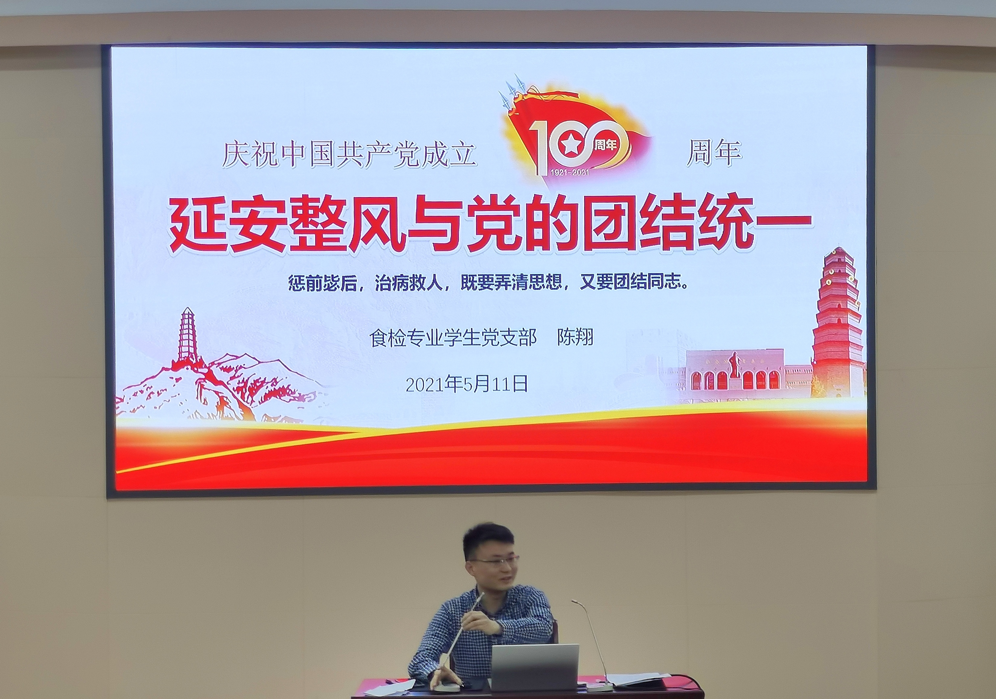 食检专业学生党支部书记陈翔为大家做党课专题授课。他以“延安整风与党的团结统一”为主题,讲述了延安整风的背景、经过和现实意义,结合史实和现实教育引导青年人要坚定中国特色社会主义理想信念,用实事求是的观点,用辩证的方法去发现问题、解决问题,在不断学习中争做合格党员。
