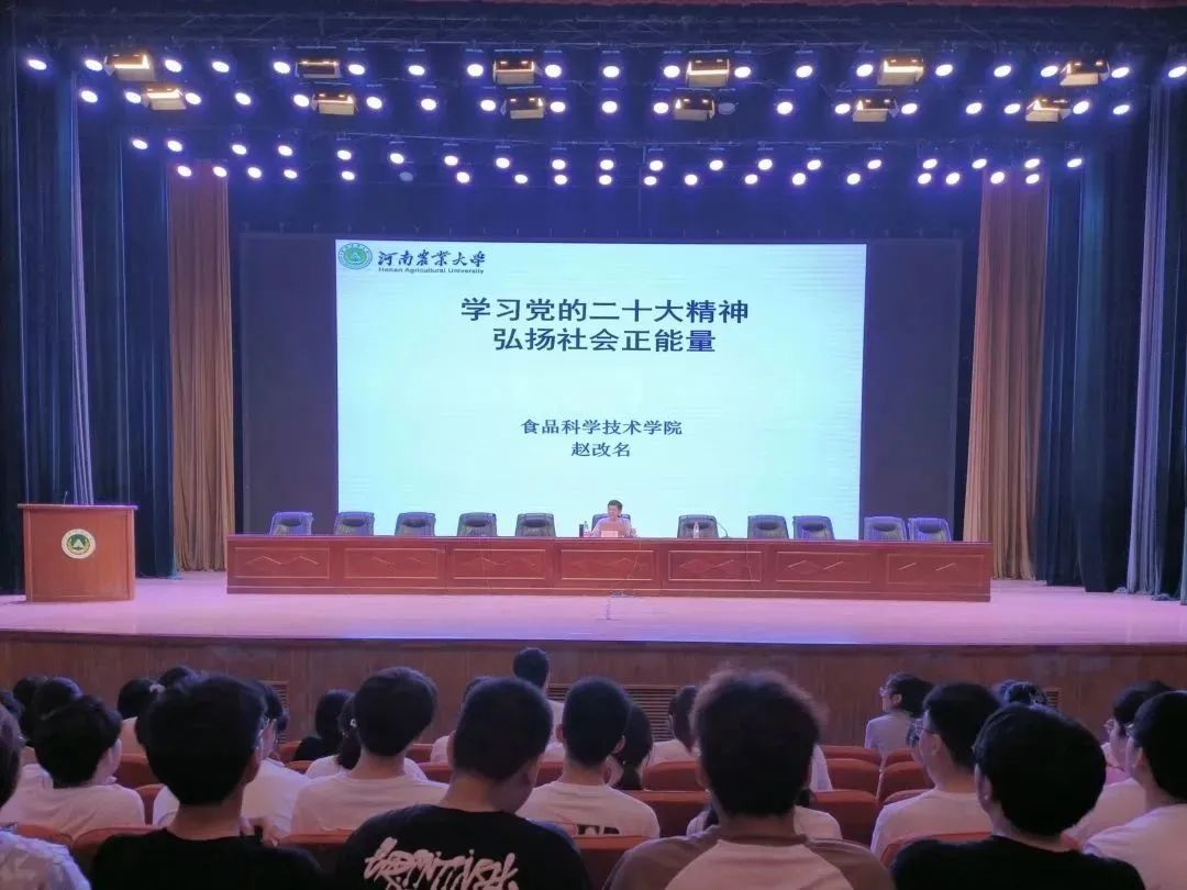 会上,赵改名以《学习党的二十大精神,弘扬正能量》为主题,引用毛泽东同志的名言强调了精神的重要性,表示精神是信仰的体现,会凝炼成灵魂的风骨,使人不至于思想贫瘠,萎靡躺平。他讲到,我们要深入学习贯彻习近平总书记在主题教育工作会议上重要讲话,全面领会习近平新时代中国特色社会主义思想,把红色资源利用好,把红色传统发扬好,把红色基因继承好,坚持学思用贯通、知信行统一。随后,他向同学们提出五点建议,一是找准精神食粮,不断激励奋斗;二是坚持文化自信,弘扬中国传统文化;三是弘扬奋斗精神,不被负能量所扰;四是以英雄为标杆,树立心中美好形象;五是要做好人生定位,坚持不懈努力,希望同学们深刻领悟主题教育重要意义,积极树立精神标杆,为全面建设社会主义现代化国家、全面推进中华民族伟大复兴而团结奋斗。