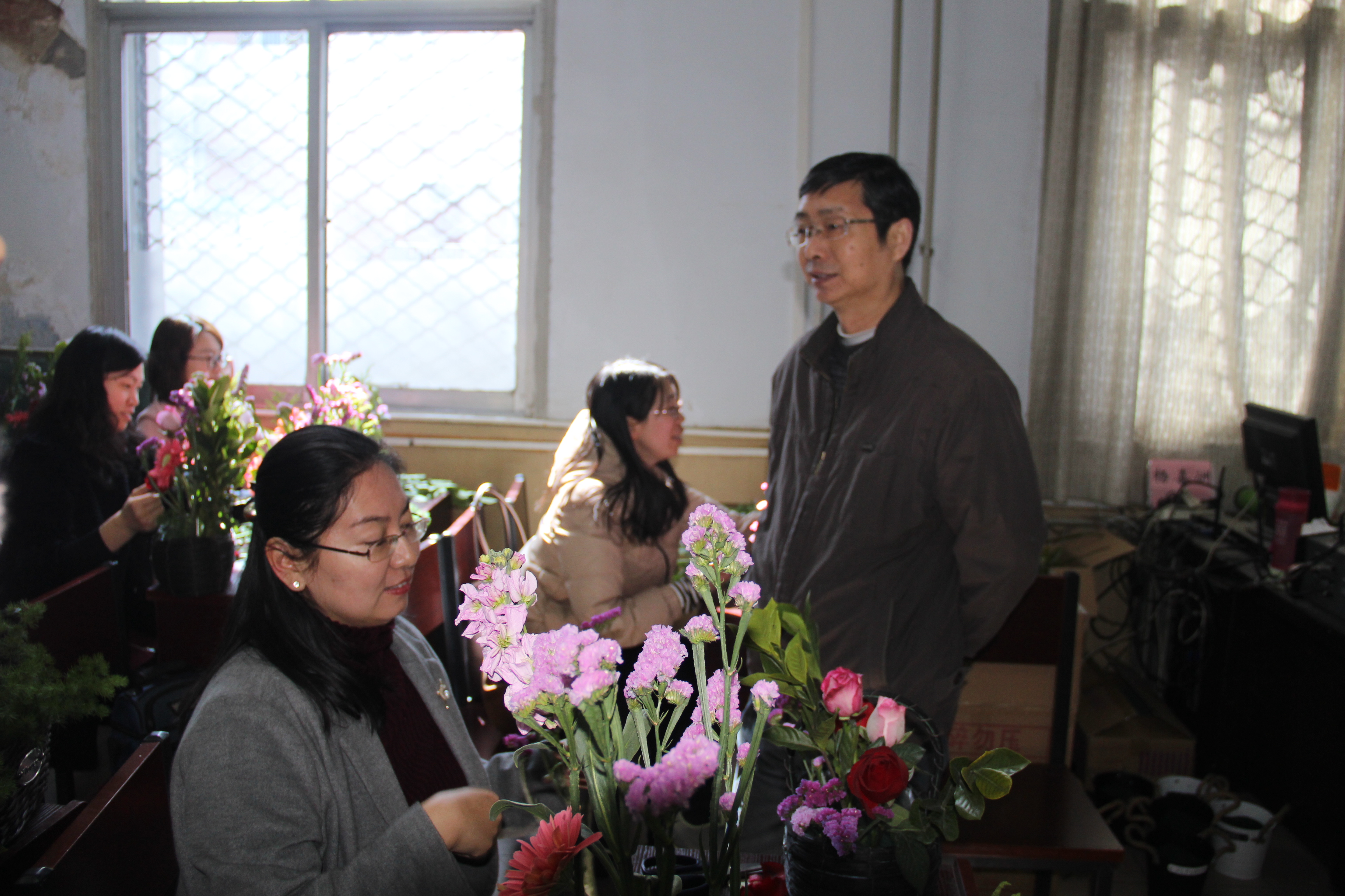 当大家都沉浸在一片欢声笑语中时,院党委书记杨喜洲也来到了活动现场并向广大女教工送上了诚挚的节日问候和祝福,杨书记亲切地与在场的老师们进行交流,还适时给予了具体的插花方法指导,我们的领导真是多才多艺啊!