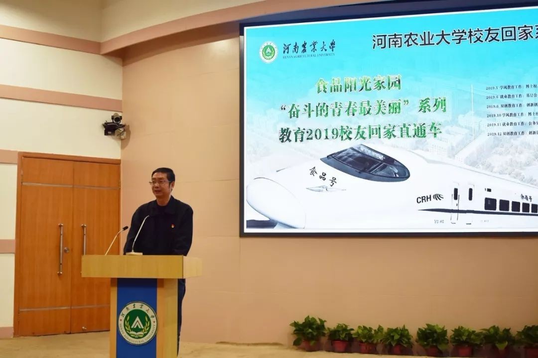在第一报告厅举办食品阳光家园“奋斗的青春最美丽”系列教育2019校友回家直通车活动。此次活动分别针对学风教育、就业教育、创业教育设置三辆专列:“奋斗号”“阳光号”“未来号”。院党委书记杨喜洲、校友办副主任梁晓辉、院党委副书记魏玮出席活动,各级学生代表参加活动。