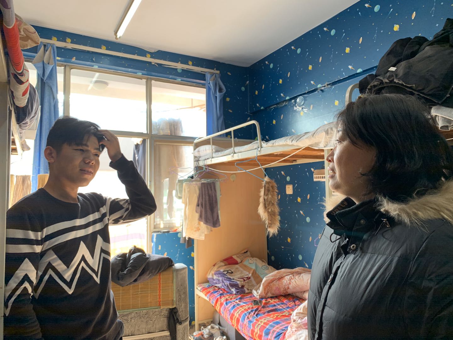 辅导员王凡、黄姗姗走访大四学生宿舍,看望即将考研的同学,了解学生生活状况及思想动态。