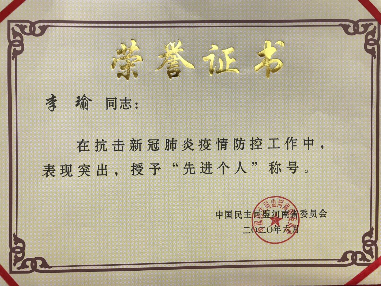 鉴于在疫情期间的突出表现,黄漫 教师李瑜同志被民盟河南省委授予“抗疫先进个人”荣誉称号。