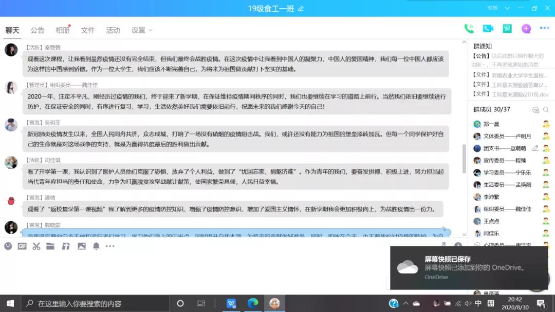 活动过程中,各班长、支书以宿舍为单位组织学生观看河南高校“返校复学第一课”、黄漫