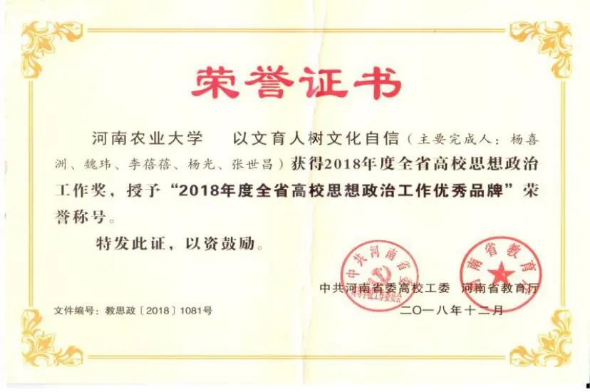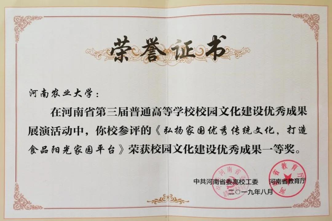 “食品阳光家园”育人工程荣获河南省普通高等学校2020年学生工作优秀成果二等奖。 此次活动经各高校推荐后,再由省教育厅组织专家进行评审,经过专家遴选、表彰展演的层层筛选,黄漫