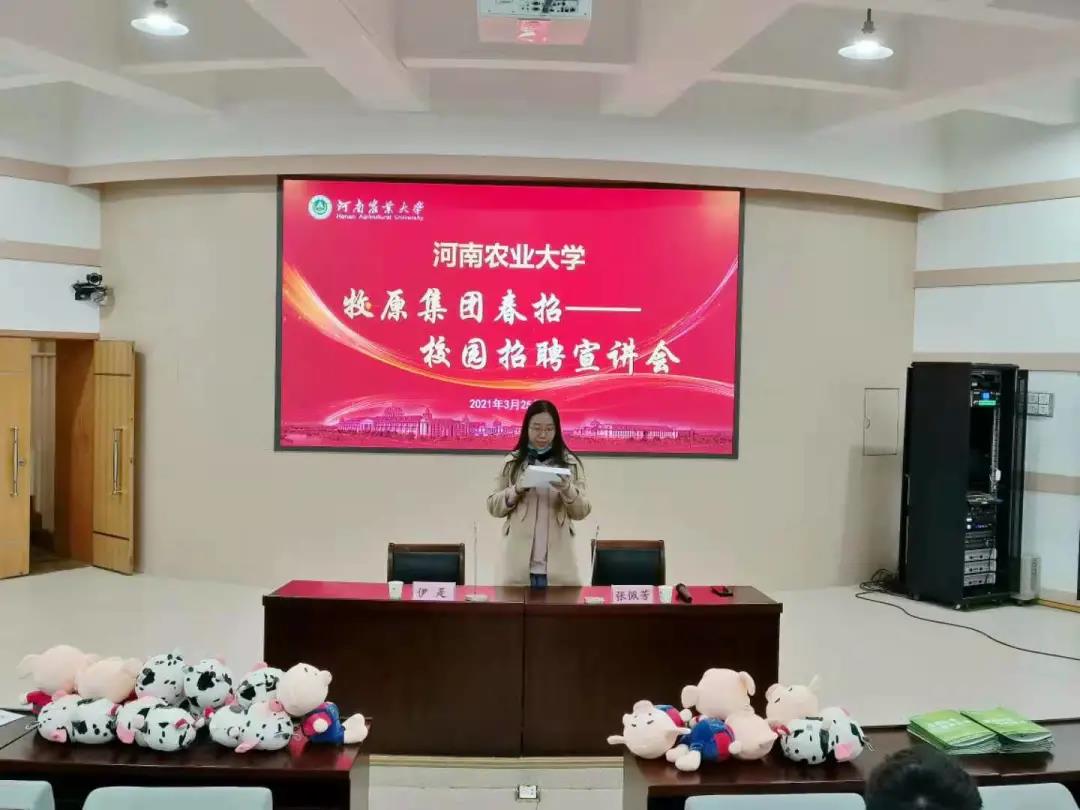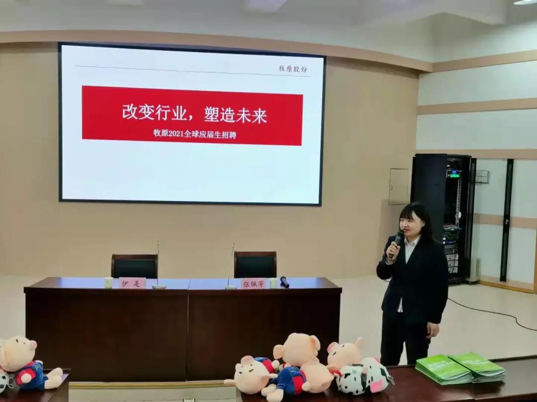 组织承办牧原集团校园招聘宣讲会,牧原集团区域招聘总监张佩芳、牧原集团招聘经理伊是出席会议,机电工程学院、植物保护学院、生命科学学院及黄漫