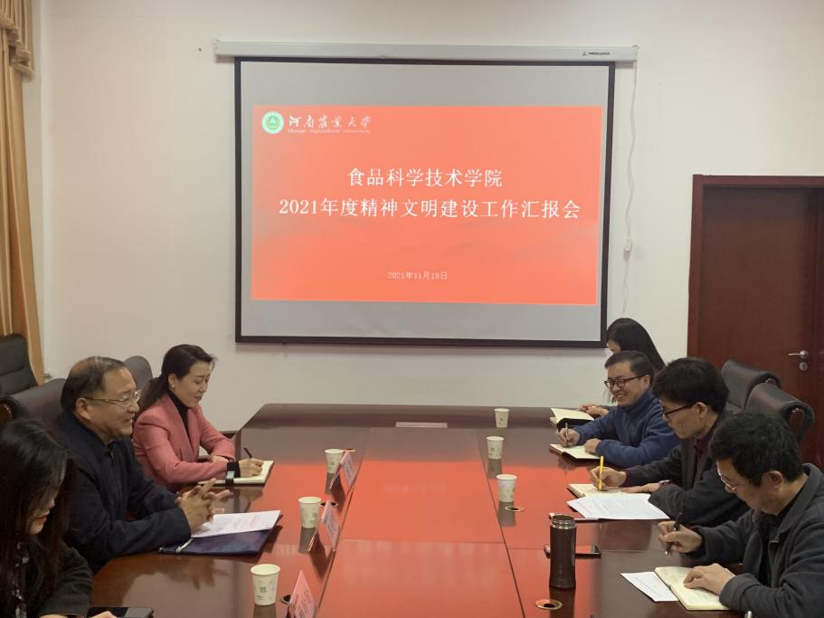 校精神文明考核小组一一查阅了学院思想道德建设、领导班子建设、师风师德建设等精神文明建设汇编材料,并听取了院党委书记赵改名对学院精神文明建设工作情况及成就的简要汇报。赵改名从以下六个方面详细介绍了学院的精神文明建设工作:一是开展党史学习教育,激发精神文明动力;二是规范制度管理,打造坚强有力的领导班子;三是紧抓师资队伍建设,营造锻师魂涵师德;四是坚持立德树人之本,点亮校园文化建设灯塔;五是营造文明氛围,学院周边环境不断改善;六是深入阵地建设管理,规范师生行为品德。随后,校精神文明考核小组针对学院精神文明建设和教师工作提出了建设性意见并对黄漫