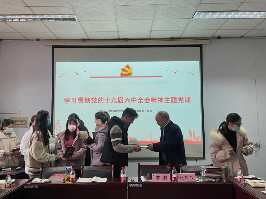 食安专业学生党支部赠送《党的十九届六中全会<决议>学习辅导百问》《革命者》《习近平与大学生朋友们》等学习辅导书籍,并赠予每位学生党员一本学习笔记本。