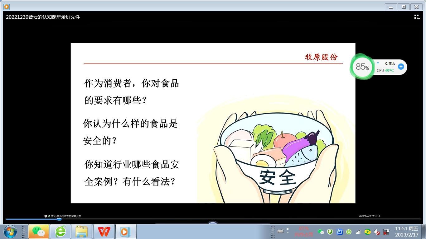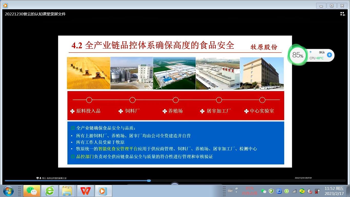 曾云工程师,从食品安全现状、牧原股份的发展现状、影响牧原食品安全的因素、牧原食品全产业链安全控制技术体系等四个大方面,展开培训。培训方式以提问、视频播放、数据分析、案例讨论等形式,向全体师生呈现了现代化牧原食品生产、加工、流通、消费中的安全管控模式,也结合能源节约、可持续发展、数字化、智能化管理等先进理念,引导同学们认识食品质量与安全管控,激发同学们对所食品质量与安全专业的兴趣,同时提升了作为“食品人”应有的职业素养和责任担当意识。