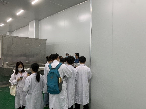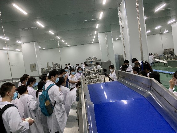 19级食工专业学生讲解中试车间各条生产线,包括鲜湿面、手抓饼、法式面包等,为学生讲解各条生产线的工艺、生产线的布局、设备等。食品工厂设计与环境保护课程组教师出席参加。