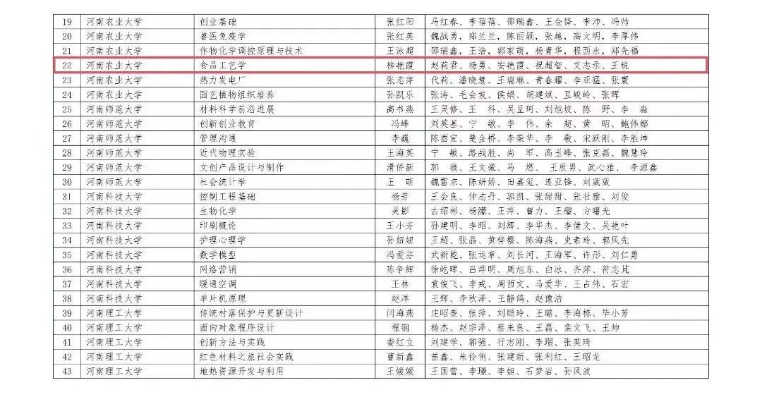教师柳艳霞带领其团队创设的《食品工艺学》课程凭借创新高效的课程思路、教学方法和教学成果成功入围河南省首批“专项融合”特色示范课程立项建设名单。