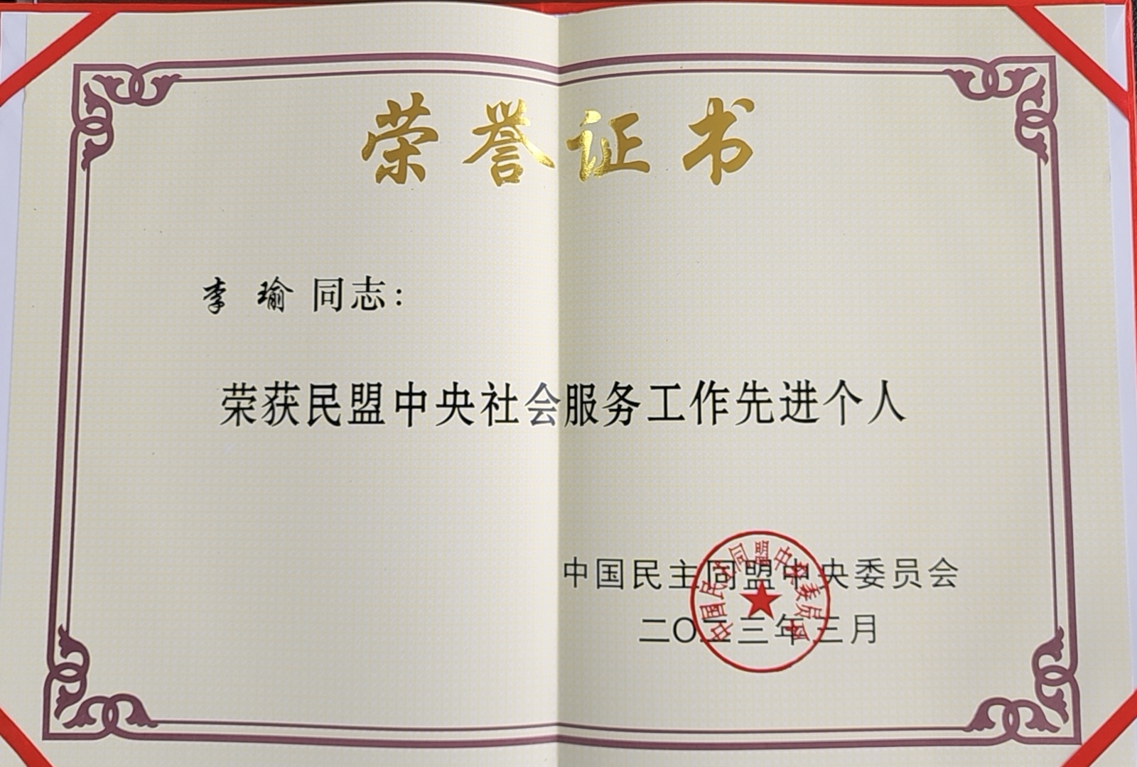 教师李瑜获民盟中央“社会服务工作先进个人”荣誉称号。
