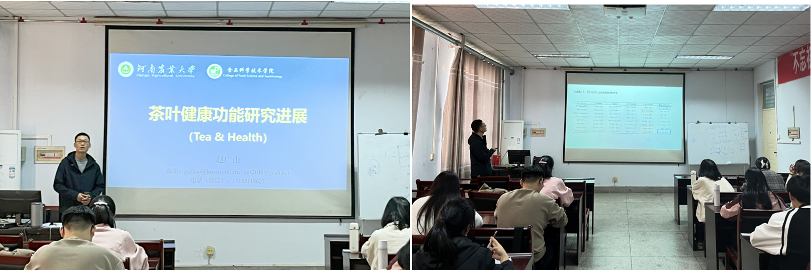 赵广山博士向在场研究生讲述了关于茶叶健康功能的研究进展,并且在讲述结束后积极解答了同学们关于茶叶健康功能的疑问,赵广山老师以其详实有趣的汇报内容,进一步加深了同学们对于茶叶健康功能的了解。