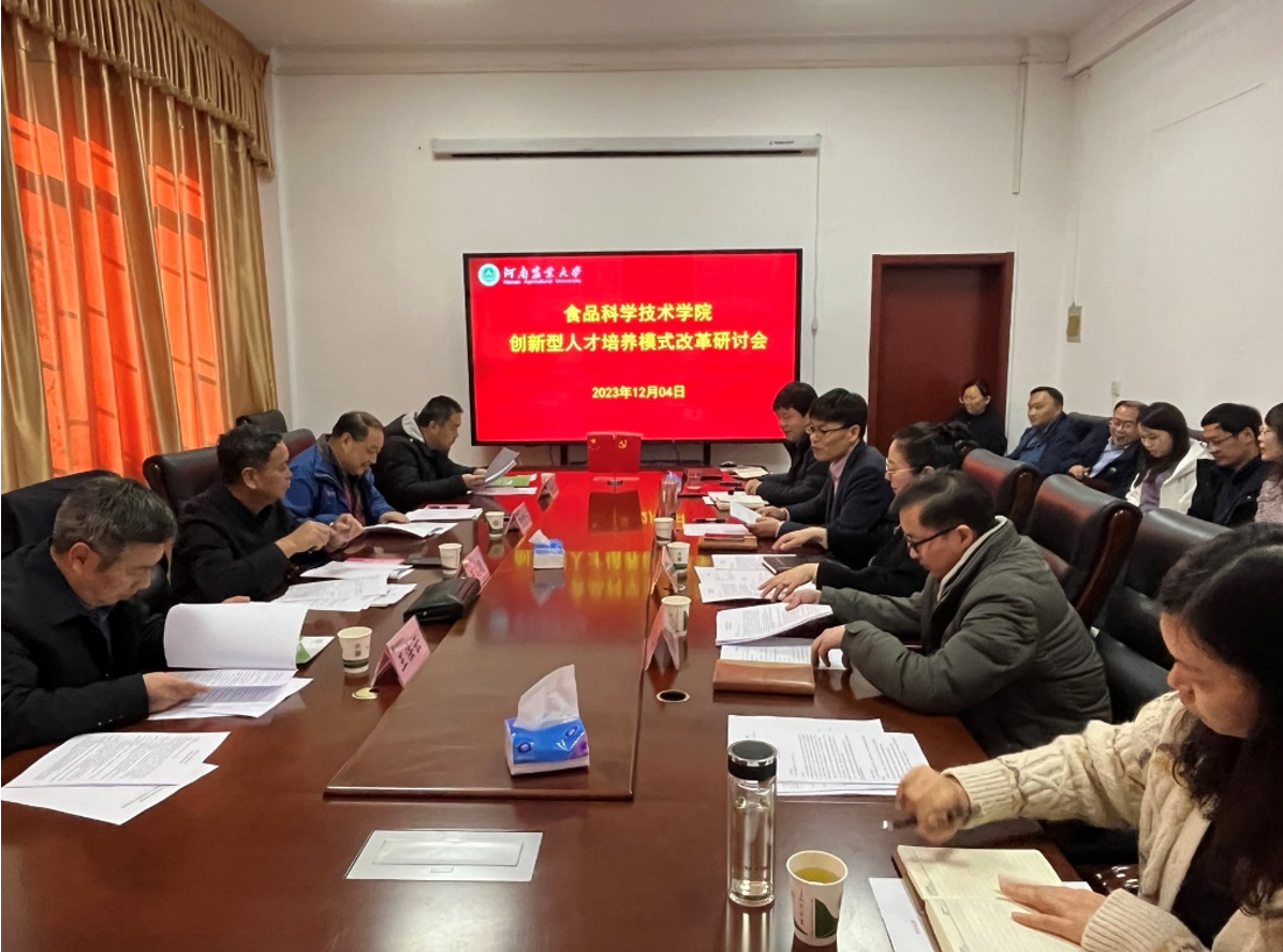 于12月4日召开了2023年创新型人才培养模式研讨会,并在此基础上签订科教融汇实践教学基地协议举办授牌仪式。会议邀请河南省食品工业科学研究所有限公司所长王瑞国、河南工业大学粮油食品学院教授张国治、河南省农业科学院农副产品加工研究中心副主任黄纪念、河南省商业科学研究所有限责任公司所长王法云等专家。院长黄现青、院党委副书记李蓓蓓、副院长张剑、副院长谢新华,办公室主任徐丽娜、食品质量与安全系主任索标及副主任孙灵霞、食品营养与健康系主任高晓平及副主任雷萌萌、中心实验室主任乔明武及副主任张蓓、教学秘书李家寅等参加了此次研讨会及授牌仪式,副院长张剑主持本次会议。