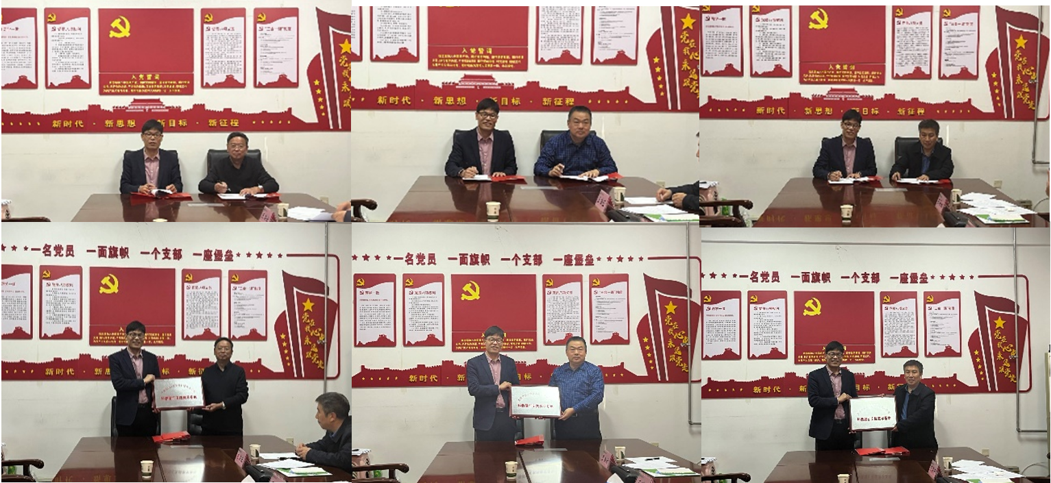 院长黄现青与河南省食品工业科学研究所有限公司所长王瑞国、河南省农业科学院农副产品加工研究中心副主任黄纪念、河南省商业科学研究所有限责任公司所长王法云分别签订了科教融汇实践教学基地协议并授牌。