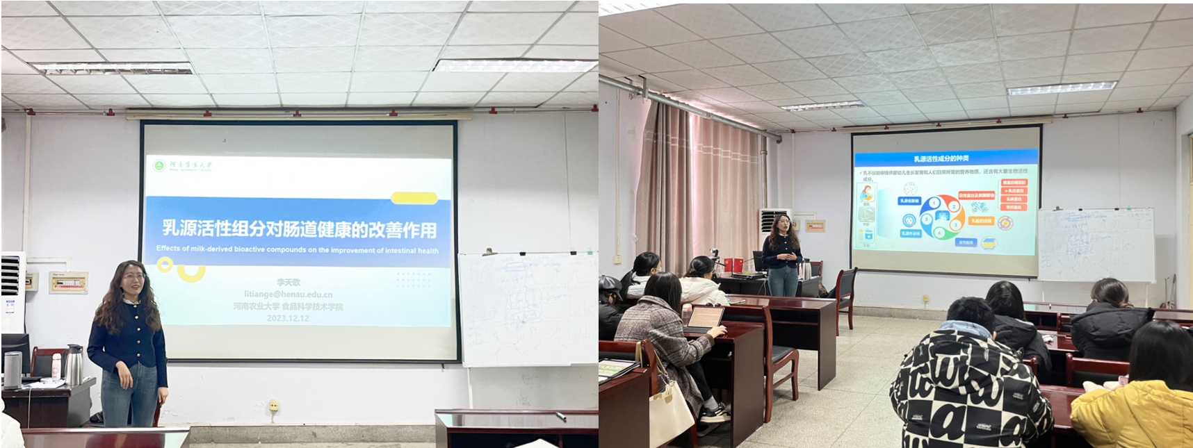 李天歌博士从肠道菌群与多种疾病的关系、乳源活性成分的种类等多方面阐述了乳源活性组分对肠道健康的改善作用。此外,李天歌老师还向在场研究生分享了在博士期间的科研趣事,鼓励同学们面对科研困难要勇于探索,不要气馁。