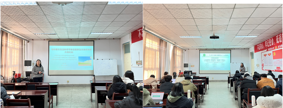 梁单博士首先就其博士期间研究领域深入讲解了马铃薯抗性淀粉调节肠道菌群及改善肥胖的作用机制,其中阐明了马铃薯抗性淀粉对肥胖小鼠糖脂代谢的调节作用以及马铃薯抗性淀粉对肥胖小鼠肠道菌群的调节作用。梁单博士精彩的报告拓展了这一领域的研究生们的研究思路。
