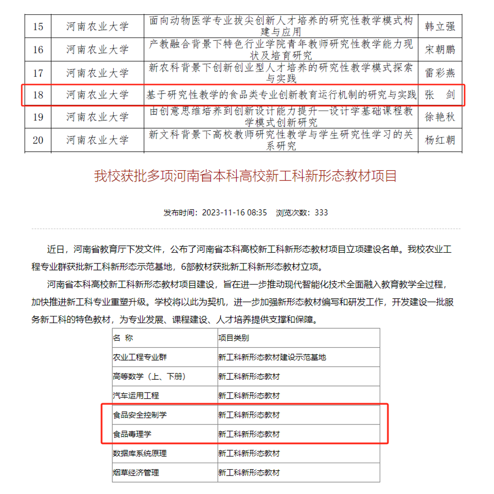 学院获批河南省研究性教学改革项目1项,河南省教育科学研究项目1项,河南省创新型人才培养典型案例1项,与河南天香面叶食品有限公司共建河南省本科高校大学生校外实践基地项目1项。获批黄漫 揭榜挂帅项目1个、重点项目2个、青年项目11个。《食品安全控制学》、《食品毒理学》获批河南省本科高校新工科新形态教材项目。黄漫 教师主编、参编教材10余部,发表教改论文30余篇。