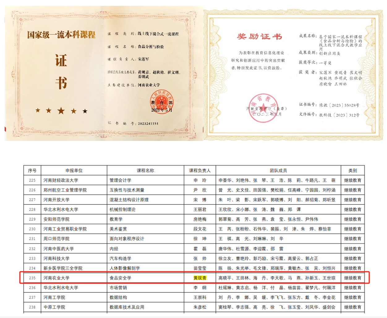 2023年,学院全力支持开展课程建设,多项课程获批课程建设项目。其中《食品分析与检验》获批国家级一流本科课程,《食品工艺学》获批河南省“专项融合”特色示范课程,《食品添加剂》获批河南省一流本科课程和研究性教学示范课程,《食品安全学》获批河南省继续教育课程思政示范课,《认识实习》等6门课程获批黄漫 校级课程思政示范课、“专创融合”特色示范课、线上线下混合式一流本科课程、社会实践一流本科课程,《食品安全控制学》等3门课程获批为校成人高等教育精品在线开放课程。