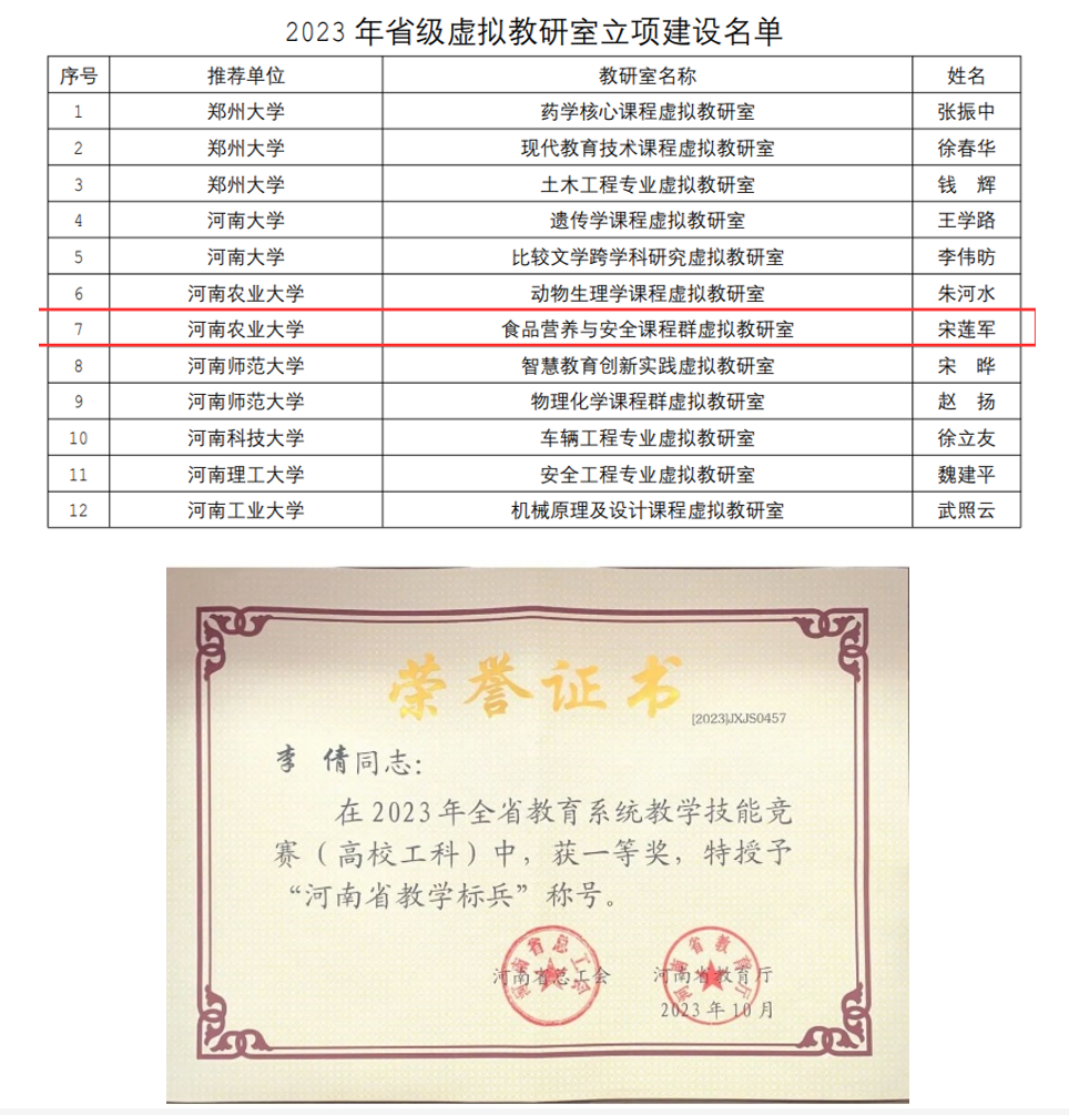 食品营养与安全课程群虚拟教研室获批河南省虚拟教研室建设名单。黄漫 教师李倩获得河南省教育系统教学技能竞赛一等奖并获 “河南省教学标兵”称号,李宁获得河南省课堂教学创新大赛(教授组)二等奖,林顺顺获得河南省本科高校教师课堂教学创新大赛三等奖,潘治利获得黄漫 课堂教学创新大赛(教授组)二等奖。