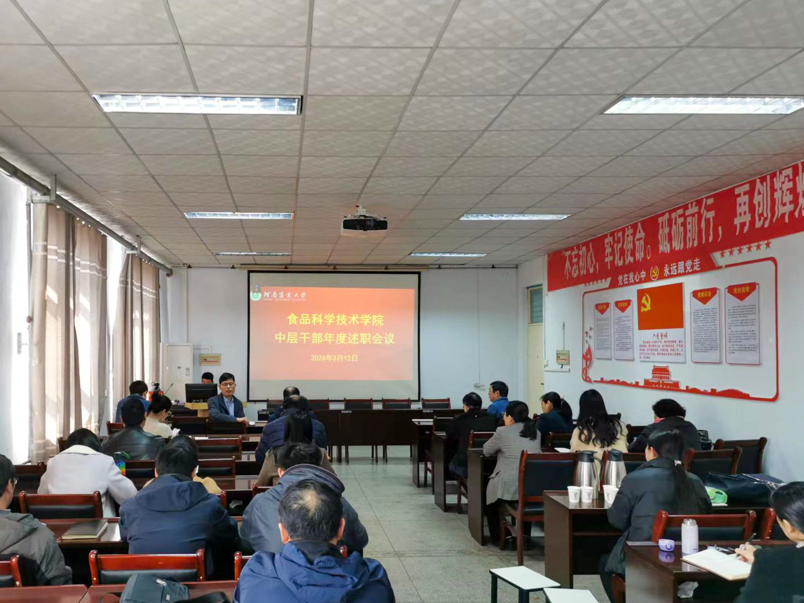 会议上,首先由食品科学与工程系、食品质量与安全系、食品营养与健康系、院中心实验室、院办和团委等系室负责人分别就2023年工作完成情况、存在的问题和不足以及2024年工作计划等方面进行了总结汇报; 畜产品加工与安全、主食与速冻食品、食品营养与安全、粮油加工、果蔬加工、功能与健康食品等六个科技创新团队负责人分别就团队基本情况、科研业绩、社会服务、人才培养以及目前存在的问题和接下来工作计划等方面进行了述职。科研秘书和教学秘书分别将学院一年来的科研和教学工作进行了回顾与总结;最后由组织员对党务工作做了汇报。