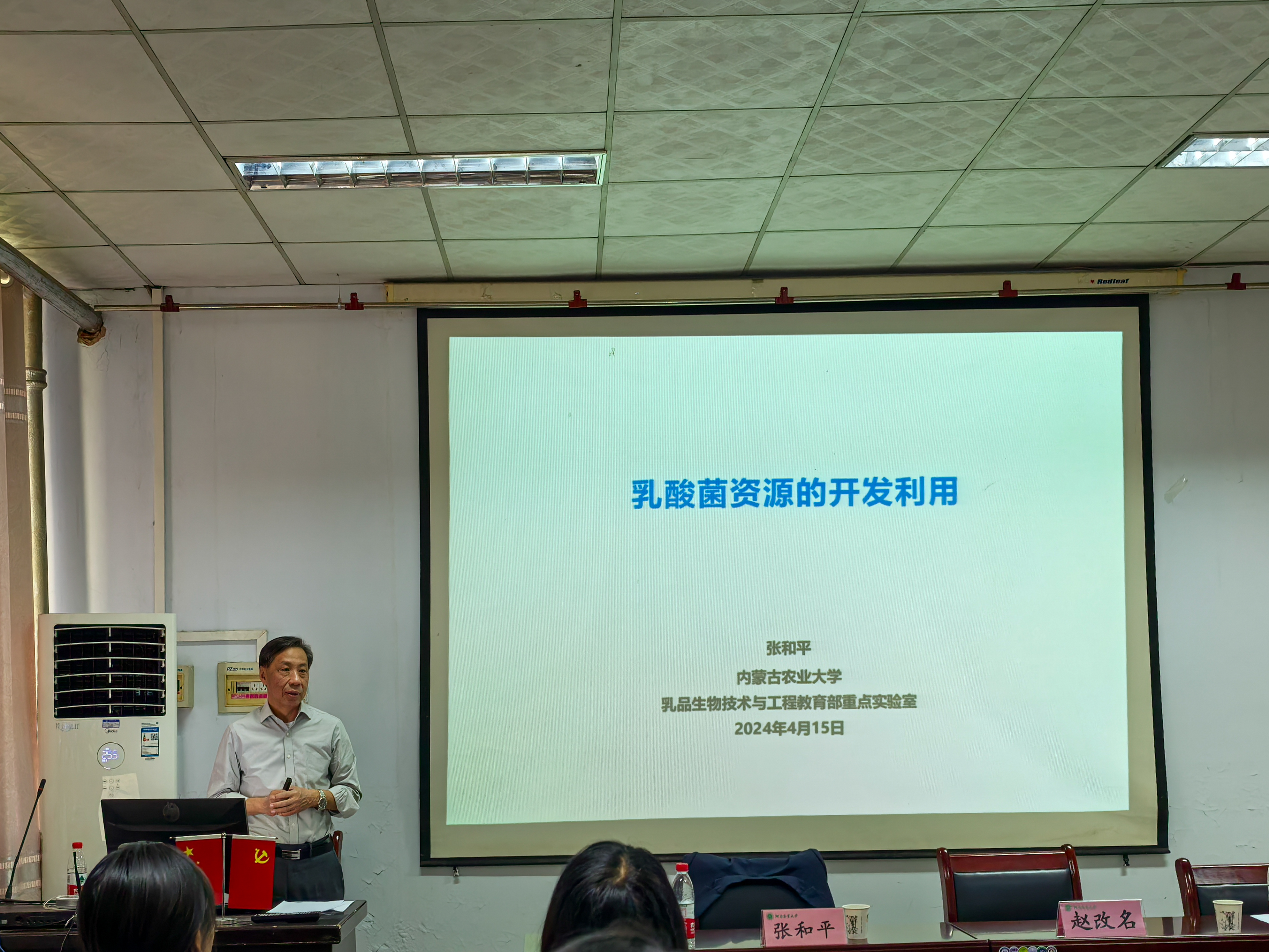 赵书记对张教授一行的到来表示热烈欢迎,并介绍了学院的学科建设、科学研究等基本情况。张教授向与会人员介绍了内蒙古农业大学食品科学与工程学院的师资力量、办学特色、相关实验团队和研究平台,随后做了题为“乳酸菌资源的开发利用”的报告并分享了自己工作30余年专注从事乳酸菌相关研究的切身体会,提出了基于人工智能筛选发酵剂的发展思路。随后,张教授一一回答了教师和学生的提问,并指出国内科研发展要致力于实现科技自强,打破“国外产品就是好”的固化思维,突破国外科技壁垒,展现出强大的自主创新能力和科技实力。
