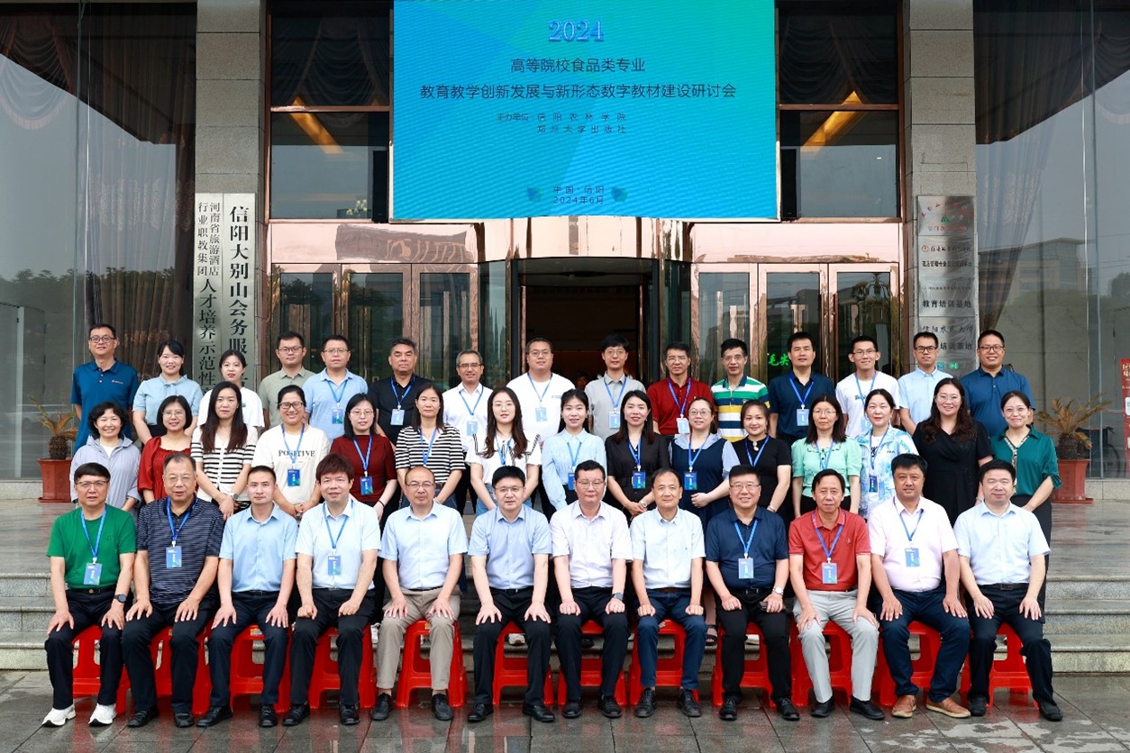 为深化食品类专业课程教育教学改革,加快构建适应新质生产力发展需求的人才培养体系,进一步加强食品类专业新形态数字化教材建设及学科发展,切实提高食品专业人才的培养质量,6月20由信阳农林学院和郑州大学出版社共同组织的食品类专业教育教学创新发展与新形态数字教材建设研讨会在信阳召开。教育部食品类教学指导委员会秘书长、江南大学教授夏文水,信阳农林学院副校长易军鹏,郑州大学出版社社长、总编辑孙保营,以及来自省内外的河南工业大学、黄漫