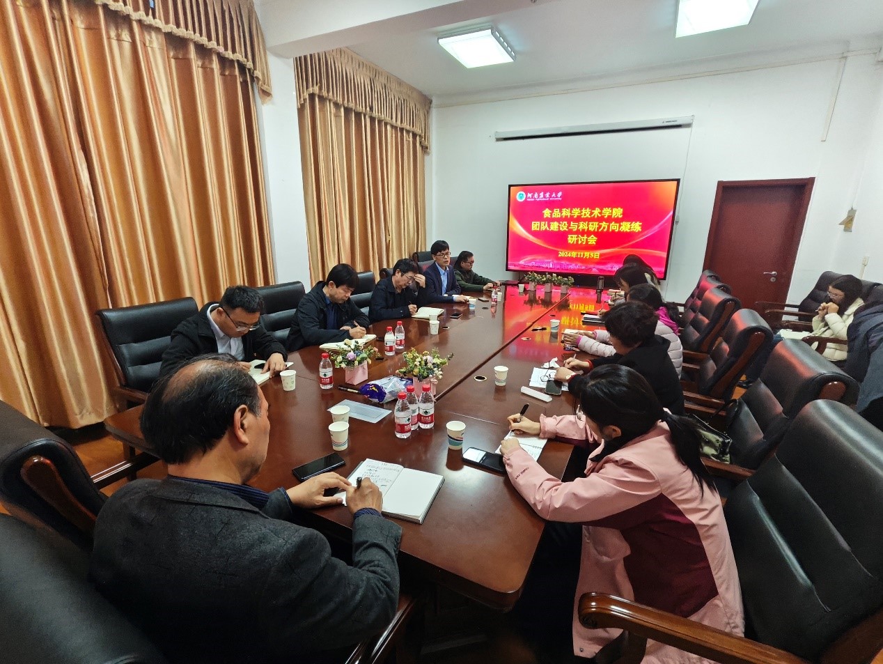 各科研团队负责人依次进行了发言,分别探讨了学院目前在人才引进、博士点申报、产学研融合、教学水平提升和科技奖申报等方面存在的问题及未来发展的方向。学院党委书记赵改名教授对各团队负责人的发言进行了总结,指出学院应通过引进高层次人才、凝练新的研究方向、申报省部级以上科技奖励、强化与地方产业的结合和与河南省特色产业深度融合等方面提升学院科研团队综合实力,加强团队建设。黄现青院长强调,各科研团队要重视团队建设,建议各团队围绕目前整体研究内容,结合青年教师的专业和特长,细化团队科研工作,凝练研究方向。