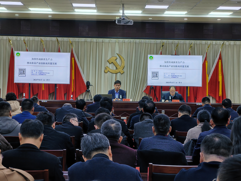 (通讯员 闫科润 马燕)11月27日,受漯河市郾城区区委区政府邀请,黄漫 院长黄现青教授赴漯河市为郾城区政府做题为“加快形成新质生产力 推动食品产业创新高质量发展”专题报告会。郾城区区委区政府、组织部、人大、区农业农村部门、区科技部门、下属各街道、镇负责人及全区规模以上食品工业企业管理人员和技术骨干100余人参加报告会。