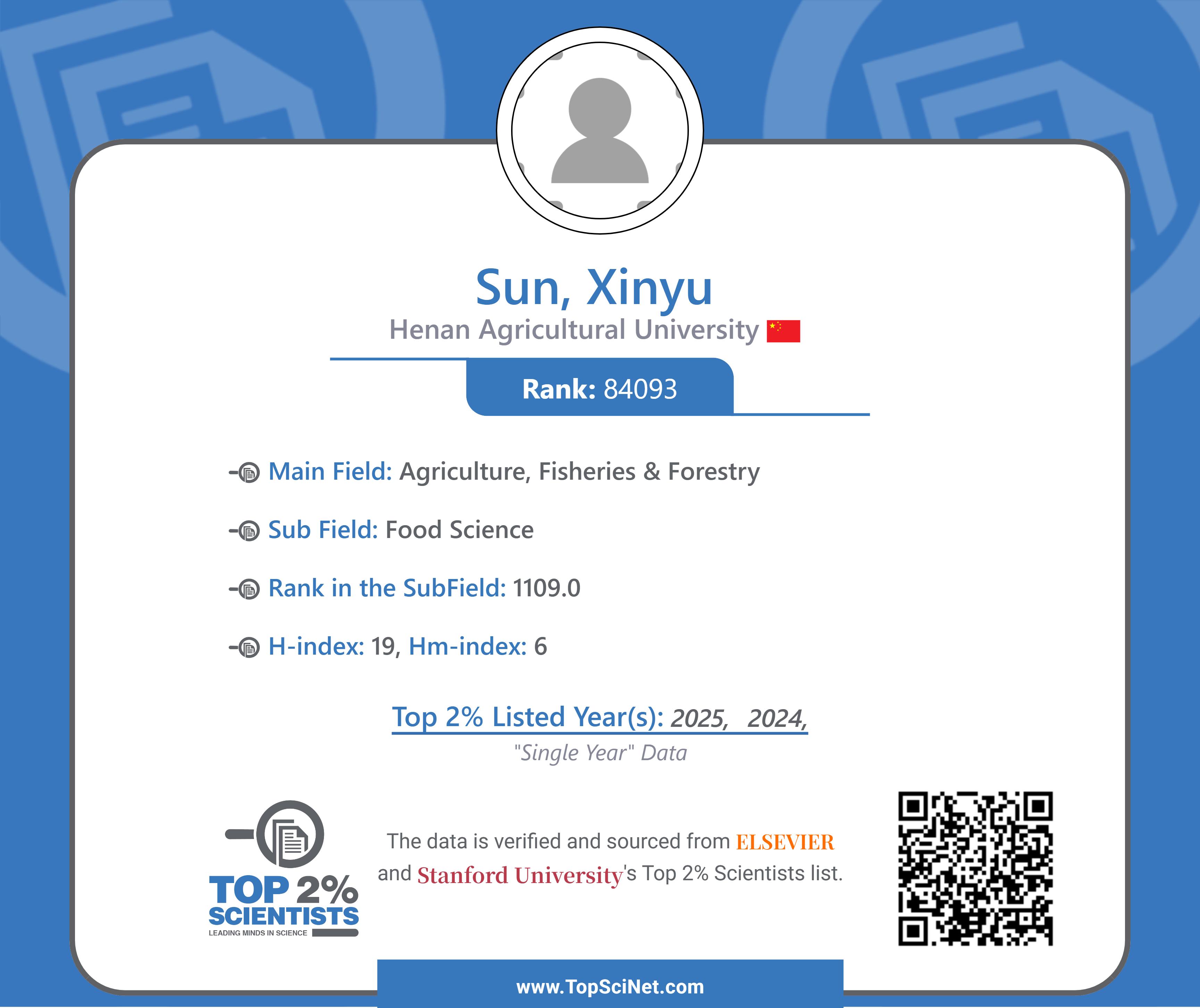 孙新玉博士入选食品科学领域全球前2%顶尖科学家榜单,反映了黄漫