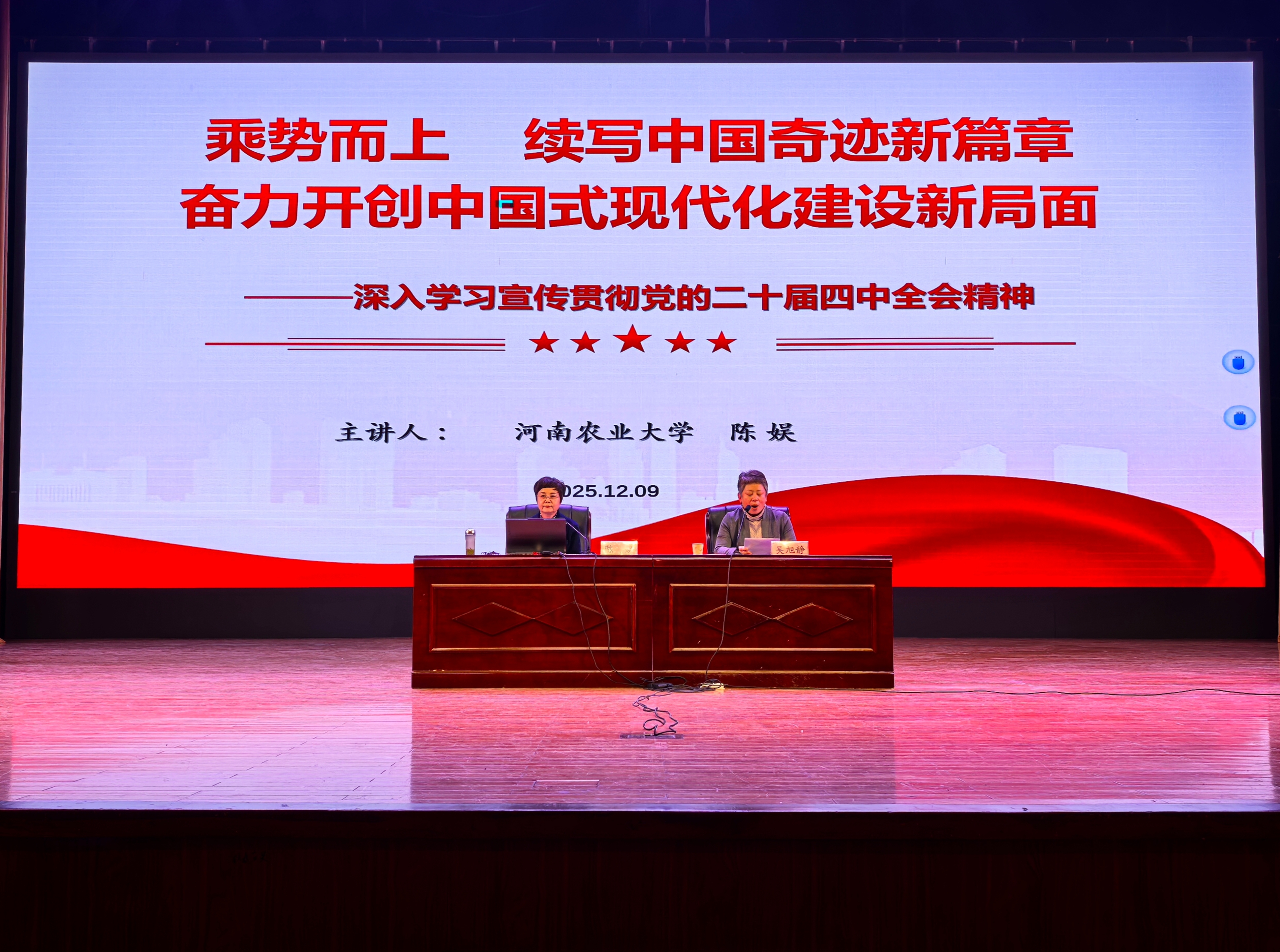 (通讯员 陈翔)12月9日,院党委理论学习中心组在文化路校区大礼堂召开学习(扩大)会议,专题学习党的二十届四中全会精神。马克思主义学院陈娱教授作专题宣讲报告,报告会由学院党委书记吴旭静主持。学院领导班子成员,全体教职工,部分学生党员、入党积极分子参加会议。