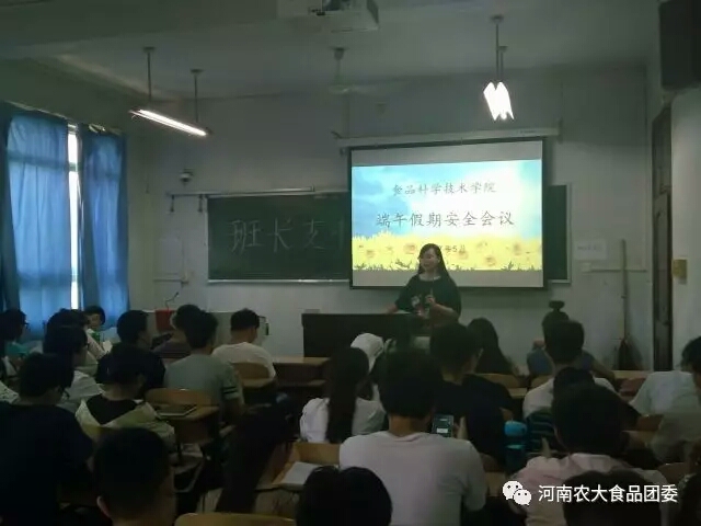 在文化路校区三号楼402教室召开端午假期安全会议。院团委书记李蓓蓓、院团委副书记杨光、院党委组织员张世昌、院辅导员孟子晴出席会议,学院2014级、2015级、2016级各班班长、支书参加会议。