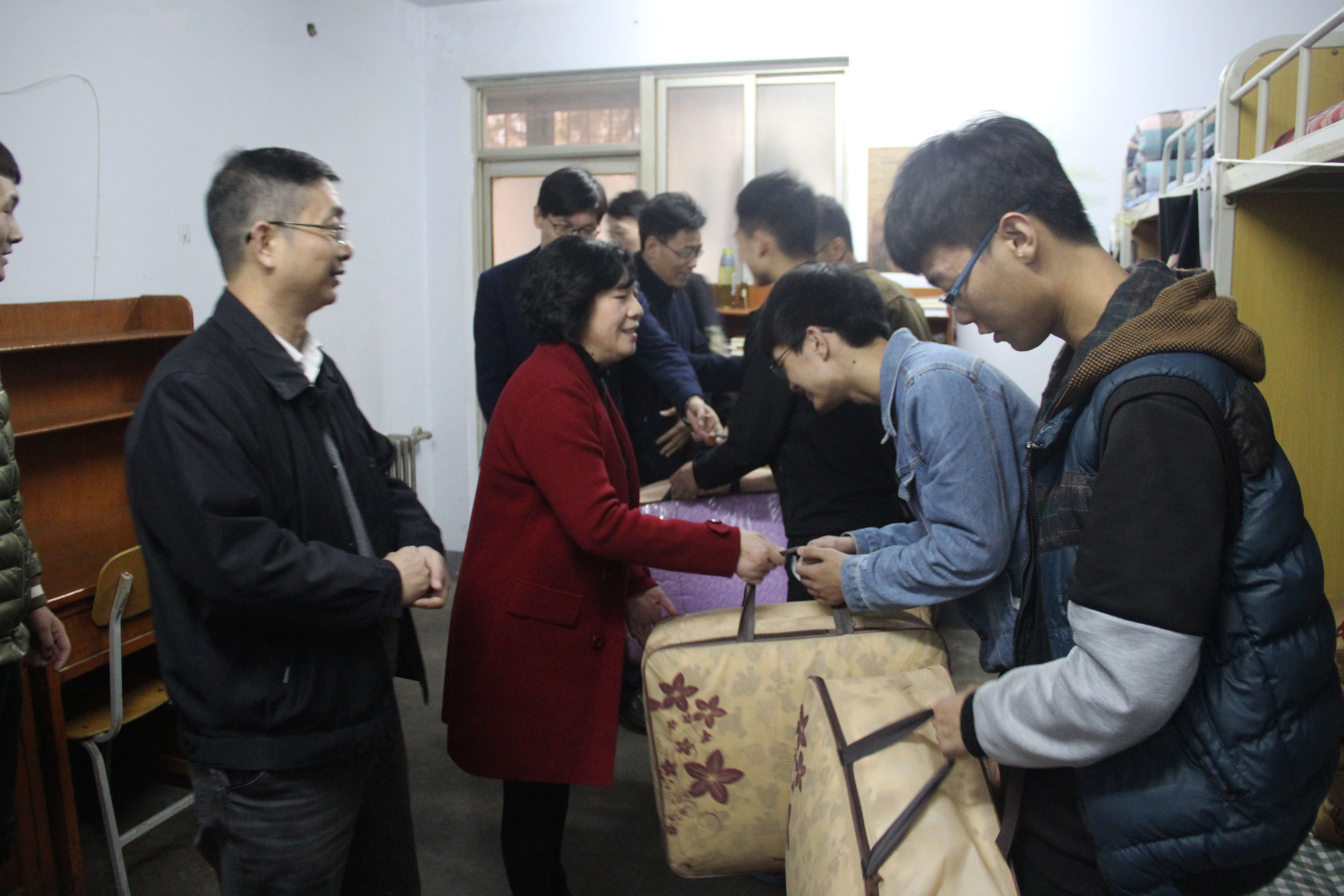 情系学子,爱暖寒冬。学院资助工作针对学生不同情况实施精确识别、精确帮扶、精确管理,确保建档立卡、贫困生受到精准扶贫帮助。领导老师们不辞辛苦,亲临学生宿舍为同学们送去御寒棉被,传递温暖与深切关怀。拿到棉被的学生脸上都洋溢着喜悦的笑容,纷纷表示将会以更加乐观的态度面对生活,争取在学习和生活上取得更大的成就,早日回报学校、回报社会。此外,赵改名还亲切地询问大家的学习生活情况以及冬季用电情况,并提醒同学们一定要注意用电安。杨喜洲寄语同学们要树立远大理想、心怀感恩之心、努力坚定信念,成为一个对社会发展有用的人才。