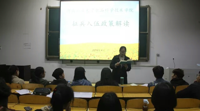 会议伊始,李蓓蓓就征兵的学习工作、就业趋势、经济补助等问题向在场学生进行了详细地说明。接下来李蓓蓓借PPT向大家讲解了征兵工作的预征对象、身体条件、参军意义等方面的内容。然后,李蓓蓓针对现场同学提出的学费减免、复学助学、入伍时间等问题做出了充分的解答,现场老师与学生有问有答,气氛融洽。最后,李蓓蓓再次强调了大学生应征入伍的好处以及对于大学生自身成人成才的意义,并希望大家都能踊跃报名,投身国防建设。