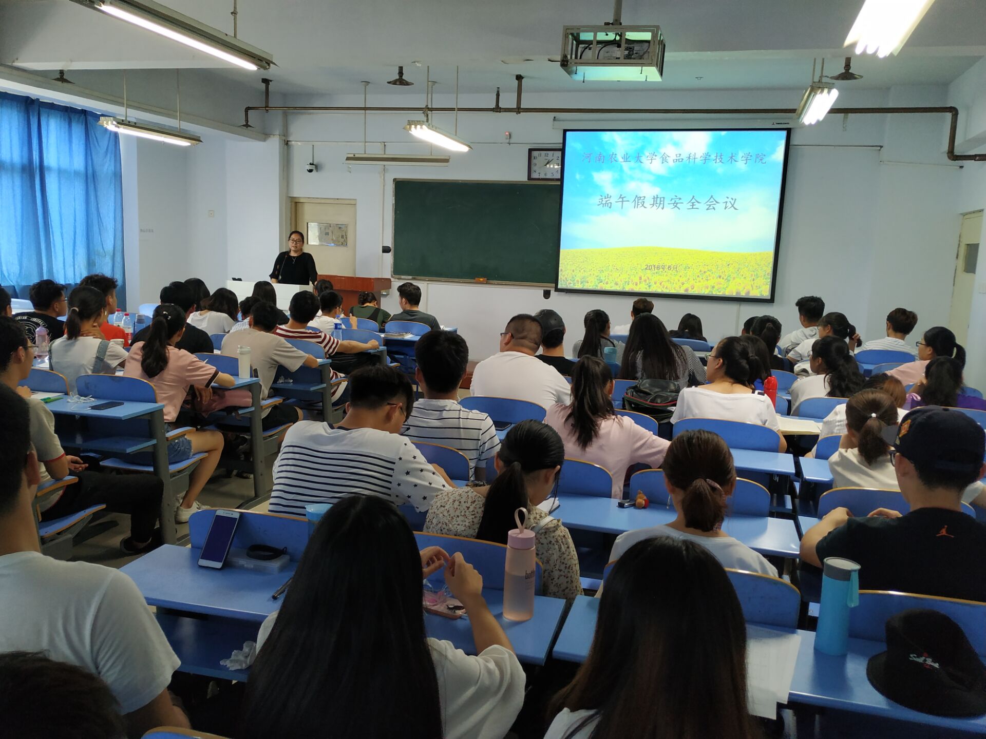 会议伊始,李蓓蓓对本次端午假期做出安排,要求各班级积极配合学院工作,如实填写假期一览去向表。李蓓蓓指出,夏季为溺水事故高发季节,大学生应理性重视,远离深水等不安全区域。随后,李蓓蓓通过列举现实生活中的实例,借以提醒同学们注意饮食安全、卫生安全及用电安全,以防止危害个人健康和场所不安全事故发生。最后,李蓓蓓建议留校同学把握复习时间,安心复习功课,做好备考准备,同时希望大家都能过一个充实、愉快的假期。