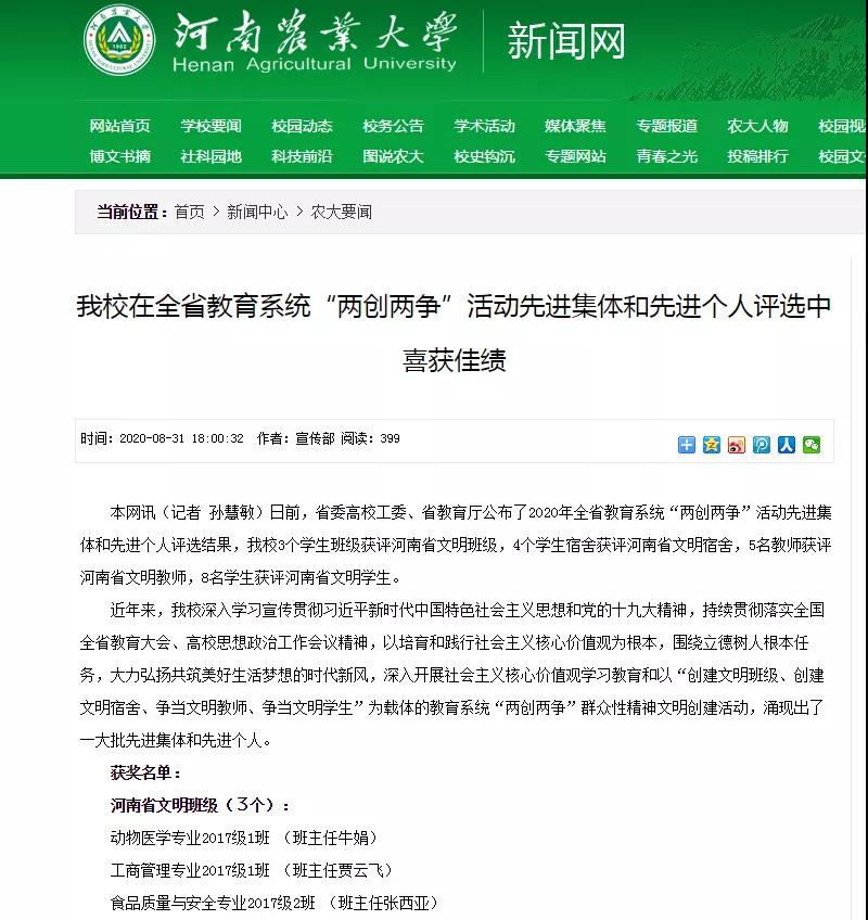 食品质量与安全专业17级2班获评河南省文明班级、2017级食品质量与安全1班韩博甫获评河南省文明学生。