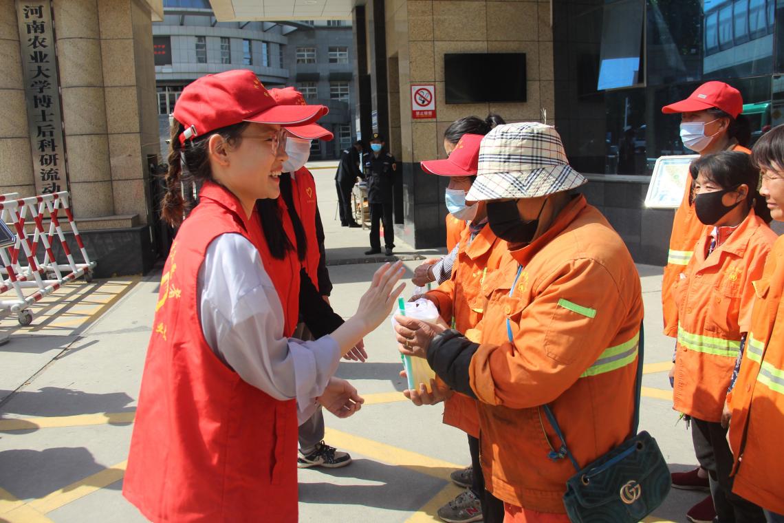 五月是火红的,是属于全体劳动者的。活动中,同学们向门卫、环卫工人和宿舍管理员送去消暑饮品,与他们热情攀谈,询问了解他们工作生活情况,深入感受他们为校园、为同学、为郑州的辛勤付出和劳动精神,对他们坚守岗位、辛勤付出表达由衷的感谢并送上节日的问候与祝福。活动现场热闹温馨,大家脸上都洋溢着喜悦,在场的人都感受到了温暖,感恩之情在一言一语中传递。最后,大家在欢声笑语中一起合影留念。