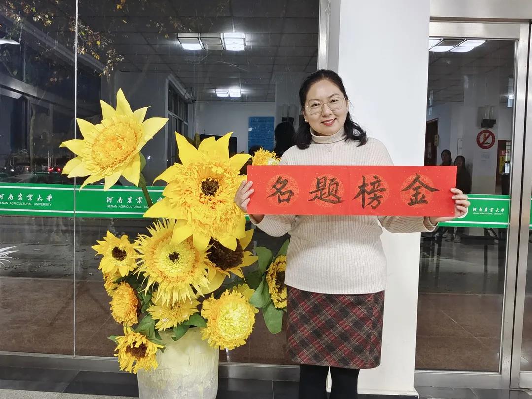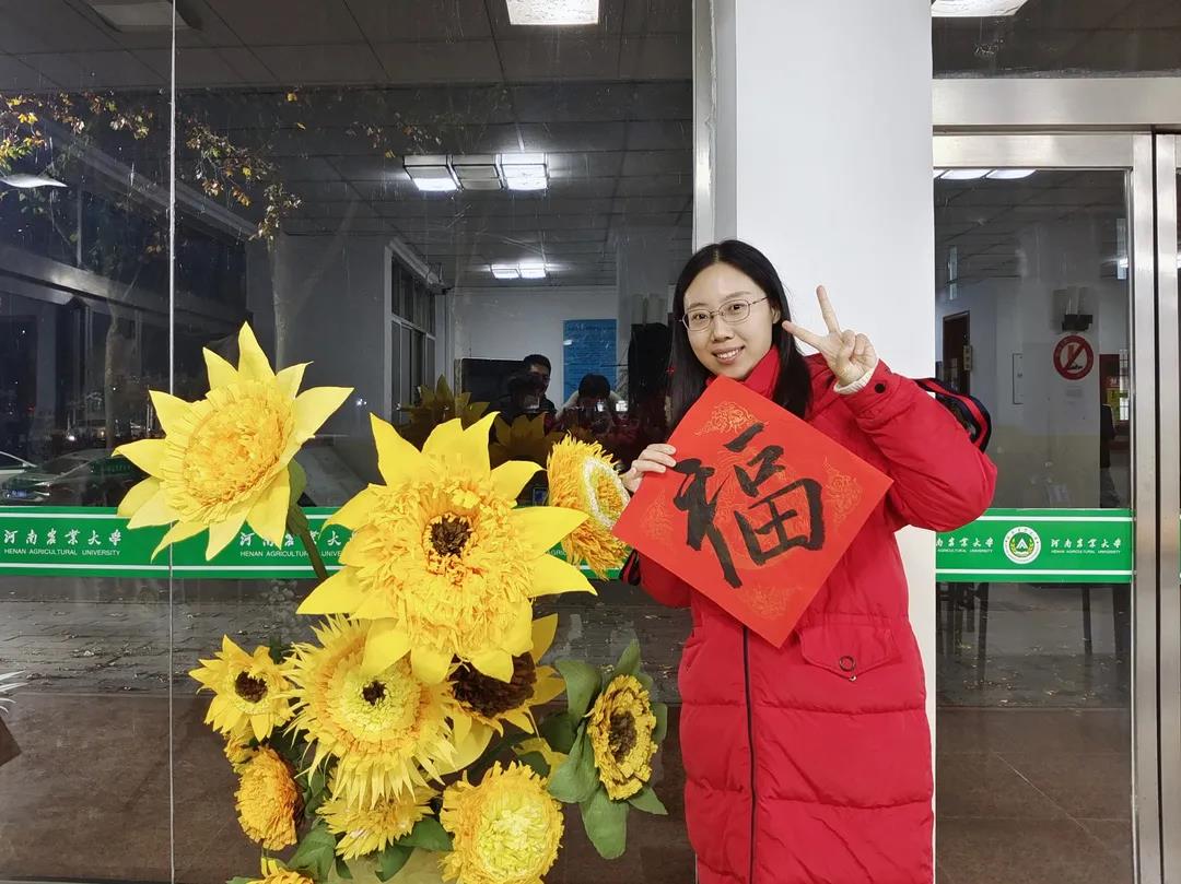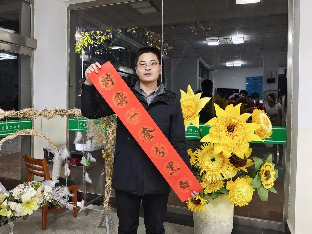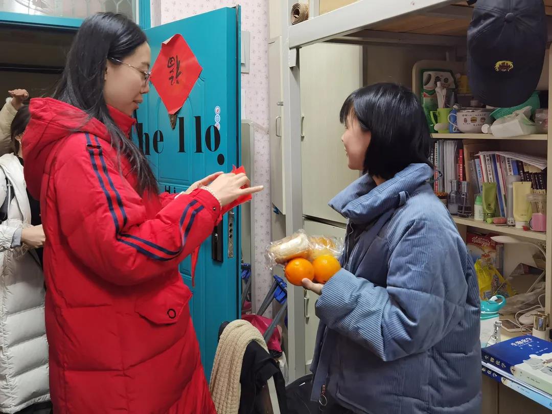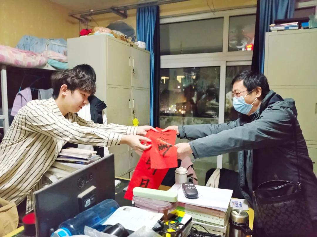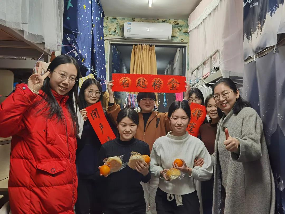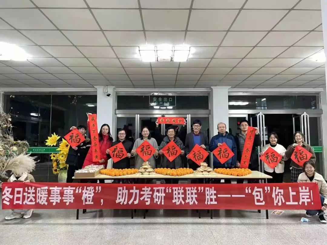 老师对考研学子的衷心祝福。“冬日送暖事事‘橙’,助力考研‘联联’胜——‘包’你上岸!”的口号和条幅预意考研学子顺心如意。老师们将60副对联亲手送到考研学子手中,并帮助他们一起把对联贴在宿舍门上,也把一份份承载着黄漫