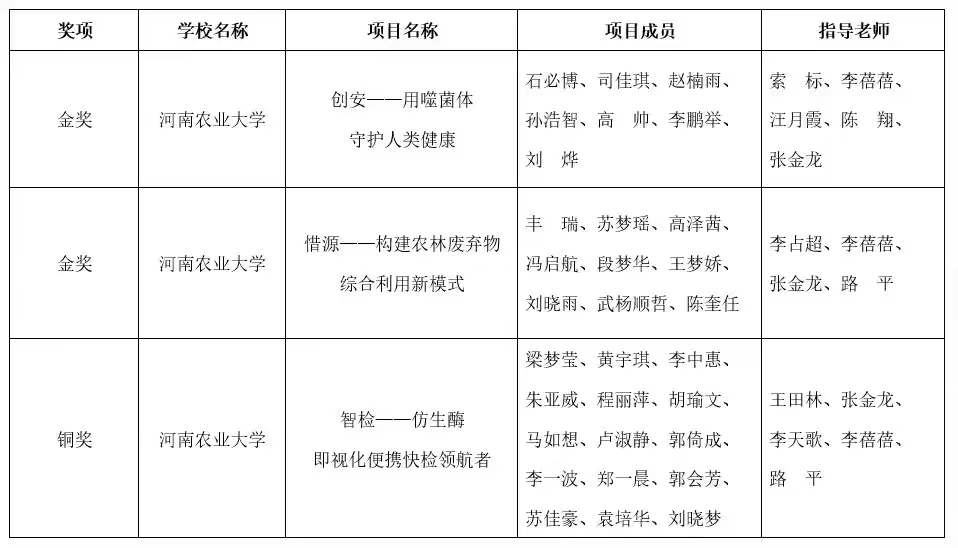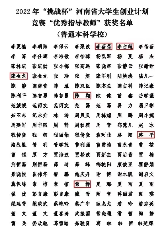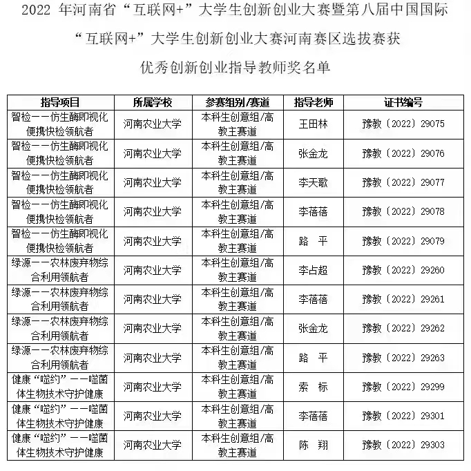 由18级毕业生石必博负责的参赛作品《创安——用噬菌体守护人类健康》和19级食检二班丰瑞负责的参赛作品《惜源——构建农林废弃物综合利用新模式》获评金奖,19级食检三班梁梦莹负责的参赛作品《智检——仿生酶即视化便携快检领航者》获评铜奖。李蓓蓓、路平、陈翔、索标、张金龙、李占超荣获2022年“挑战杯”河南省大学生创业计划竞赛“优秀指导教师”称号。