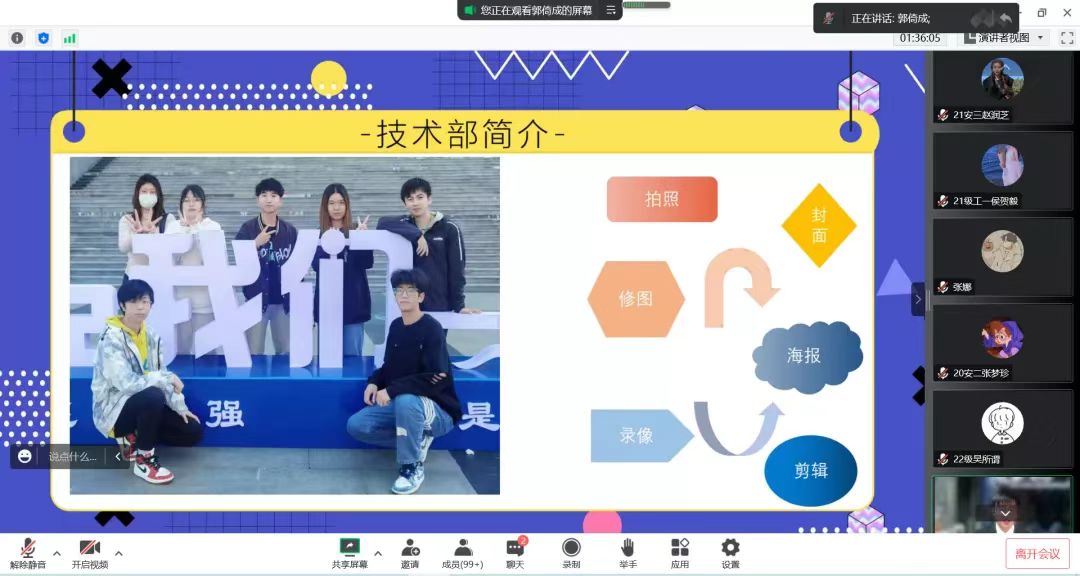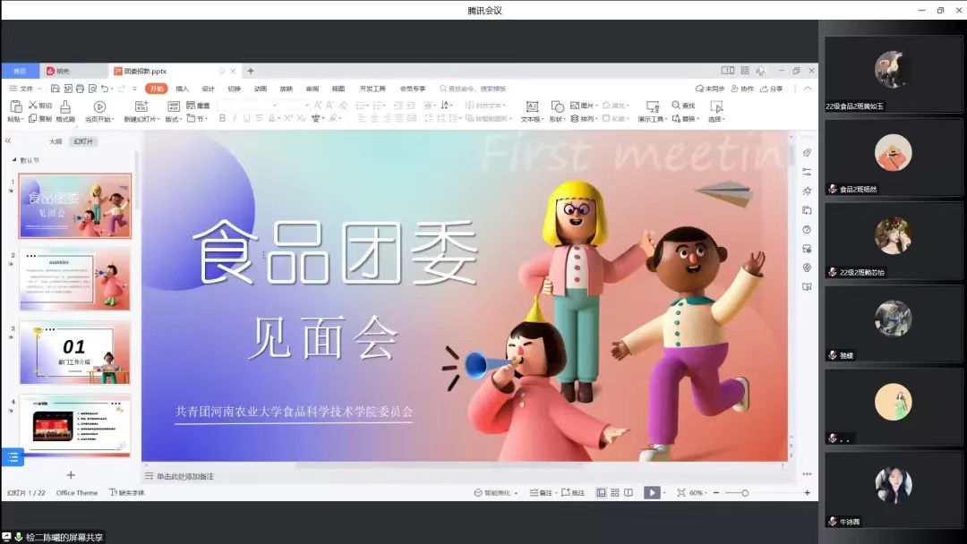 党建中心和团委依次用PPT详细地向同学们阐述了各部门的主要工作,并对22级新生表达期许与展望。自我介绍时,部分部门成员现场展示才艺,会议过程热闹非凡。