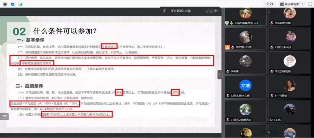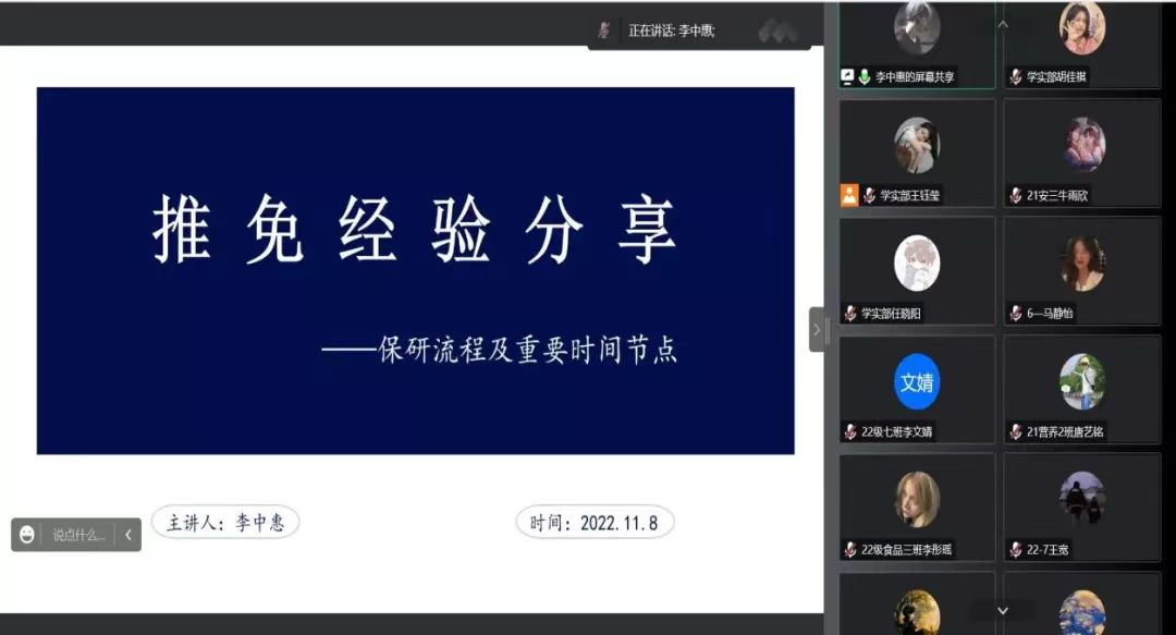 李中惠向同学们具体介绍了保研的流程和重要的时间节点,分享了自己的保研经验。她强调,大家在校期间要努力提升自己的学习成绩,在投简历时要相信自己,做到敢投、广投、海投。