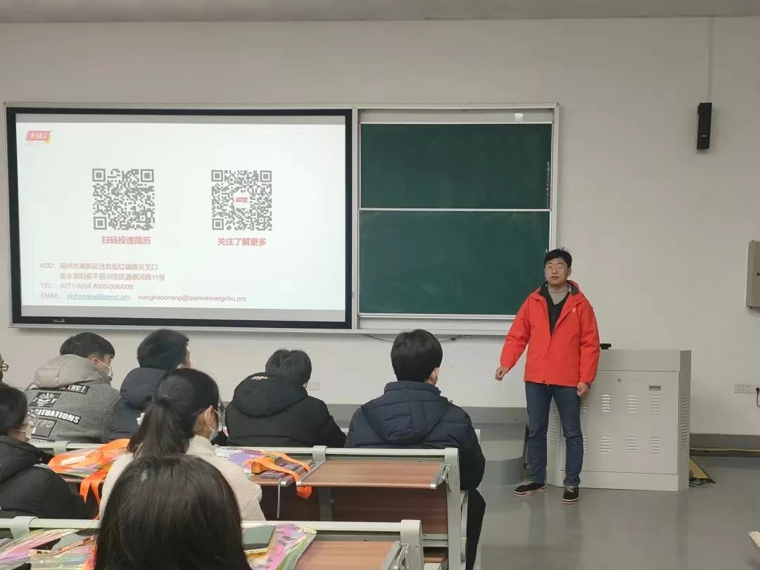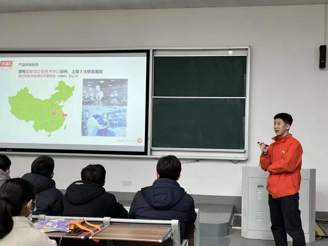王昊程通过播放宣传片的形式使同学们对千味央厨有了初步的了解。他从企业概括、特色产品、渠道分布、黄漫等五个方面向同学们介绍了千味央厨公司的历史和发展情况,着重讲解了公司实习就业的工作环境,薪资待遇和发展路径等大家关心的问题,并对同学们的到来表示欢迎。