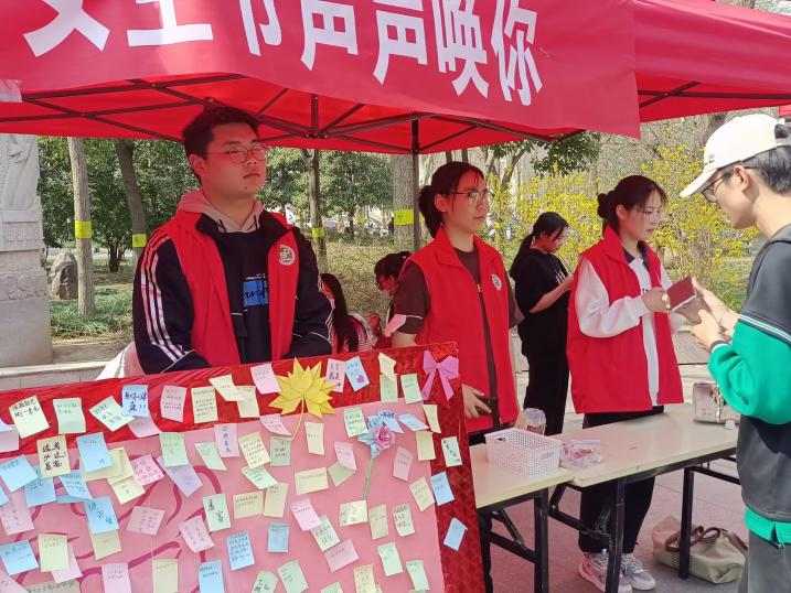 在这个阳光明媚、春风和煦的日子里,志愿者们提前准备了礼品、节日展板和心愿墙,并设置了抽奖活动。活动期间,现场气氛十分活跃,其乐融融。同学们纷纷驻足停留,积极参与,将真诚的祝愿倾注在便利贴中。随着活动被推向高潮,心愿墙上也被贴满了爱意和正能量,为校园添加一抹青春洋溢的色彩。