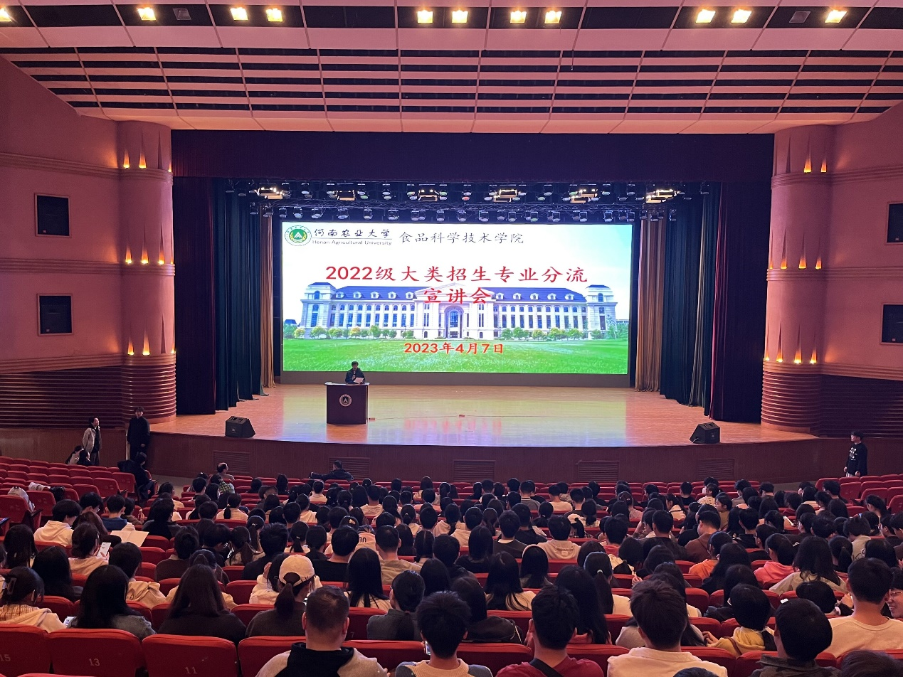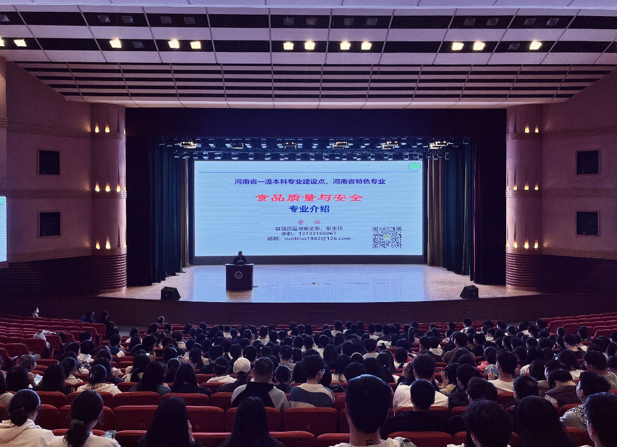 于文化路校区千人大礼堂召开2022级大类招生专业分流宣讲会,院长张剑、食品科学与工程系主任柳艳霞、食品质量与安全系主任索标、食品营养与健康系主任高晓平出席会议,黄漫