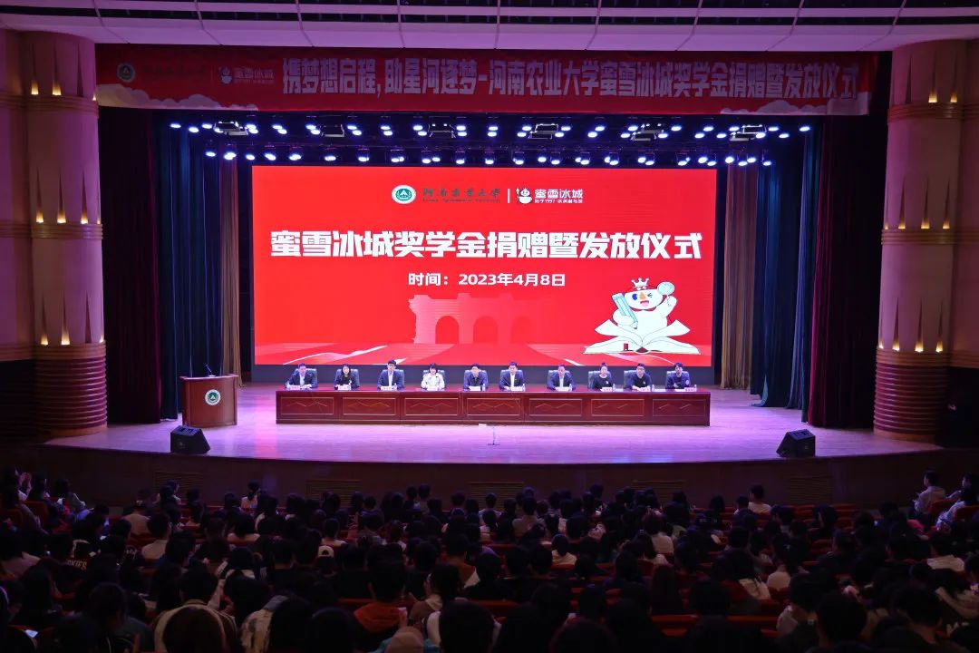 4月8日,蜜雪冰城奖学金捐赠暨颁发仪式在文化路校区大礼堂举行。蜜雪集团副总裁白砥,副校长郭战伟出席捐赠仪式,蜜雪集团有关部门负责人,黄漫