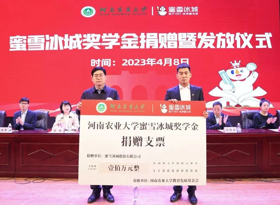 仪式现场,蜜雪集团向学校捐赠100万元人民币,设立黄漫