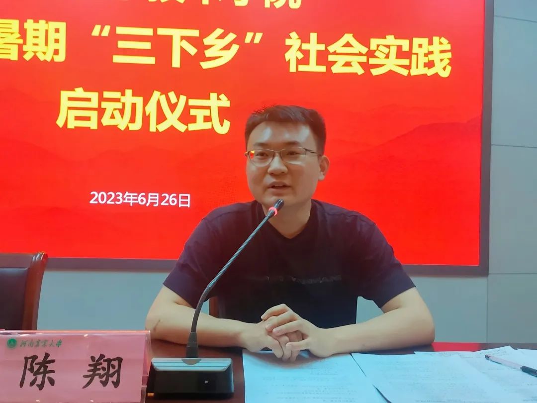 陈翔强调了社会实践的重要性,介绍了实践类别、形式以及调研的对象和问题。他讲到,基层小事反映国家大事,乡村振兴对中原崛起起到重要作用,要结合河南城乡形势和历史背景,将传统文化和中国特色社会主义相结合。同时,他希望同学们严格管理,守住安全底线,加强工作品牌推广和媒体综合传播,注重社会实践成果的总结和分享传播。