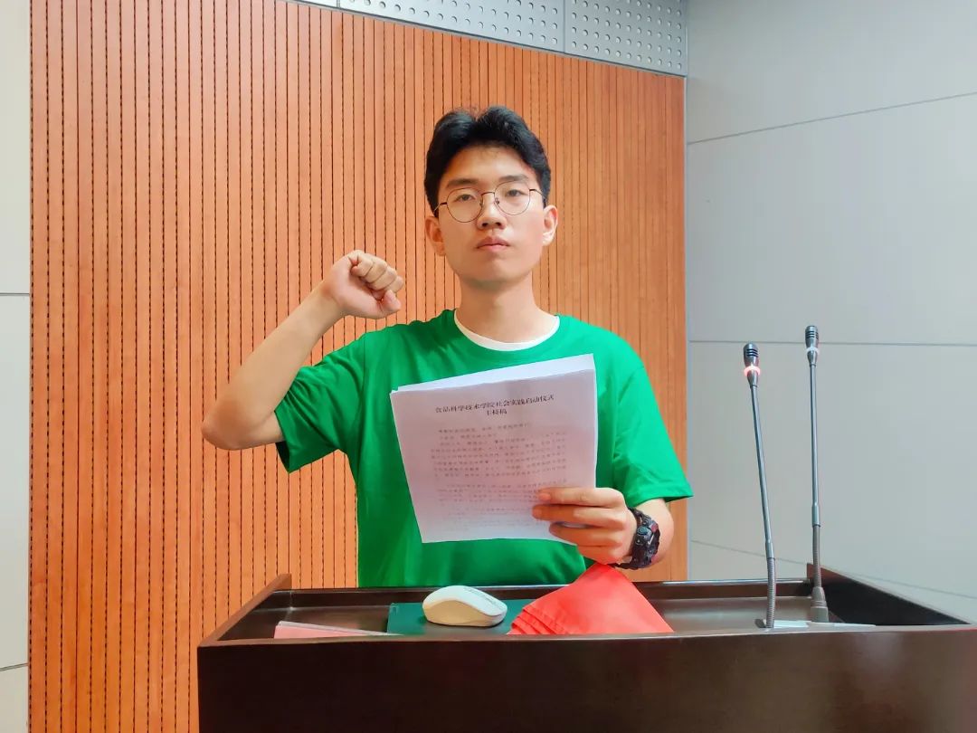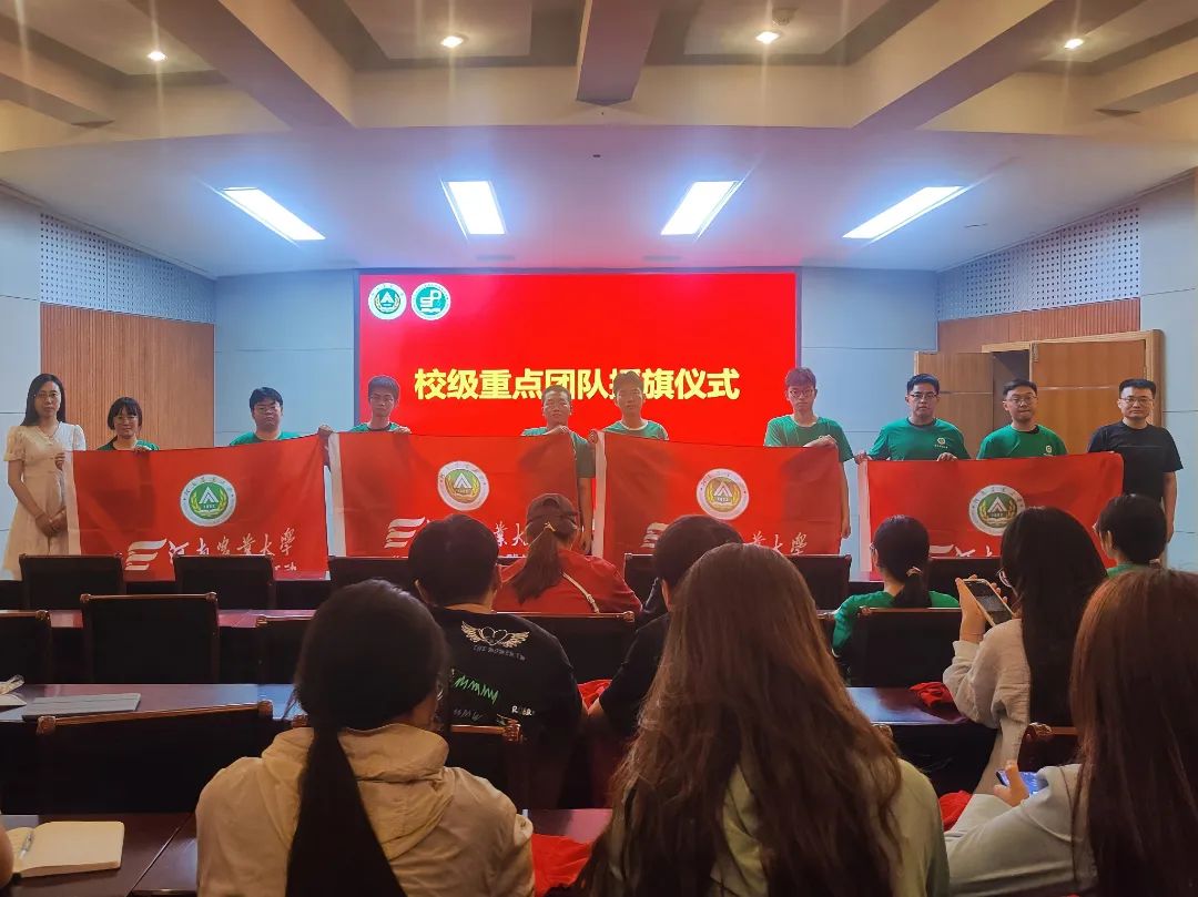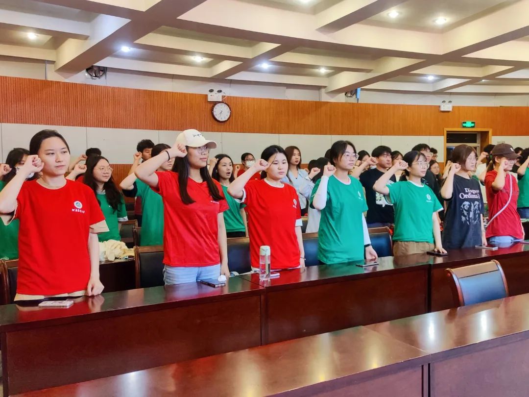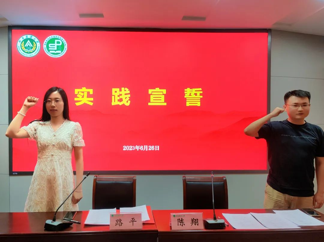 在授旗仪式中,老师们将充满希冀和使命的旗帜传递到各个团队的负责人手中,并合影留念。随后,由成员代表王玉坤带领同学们进行庄严的实践宣誓。