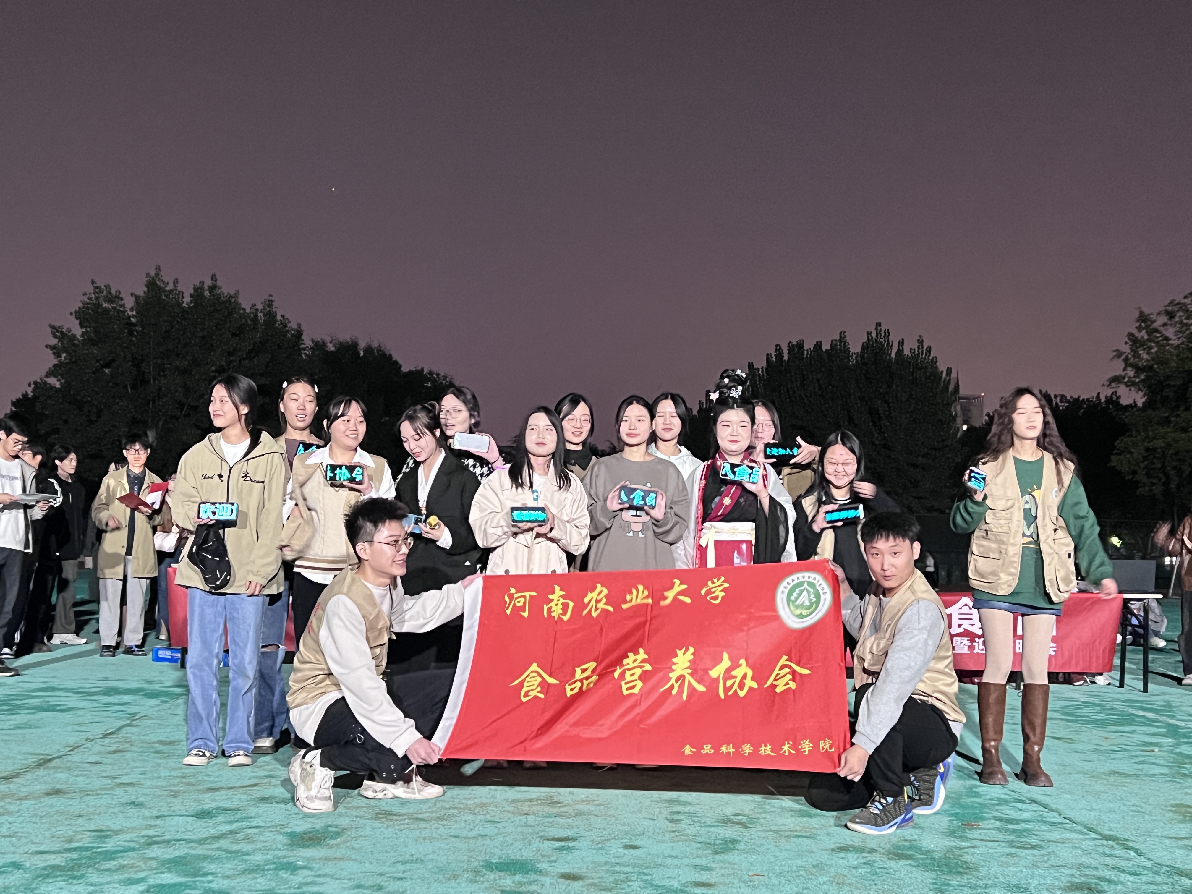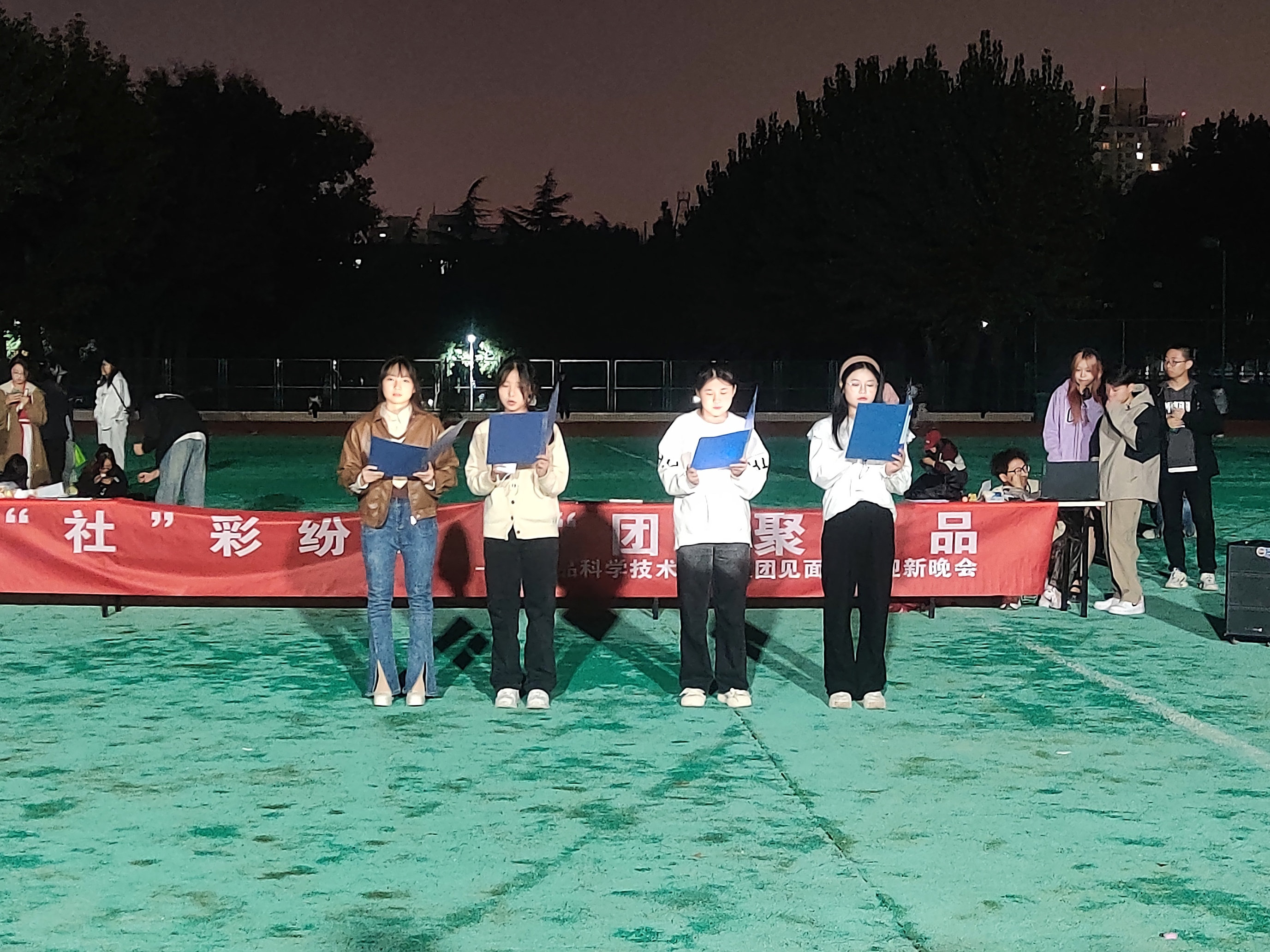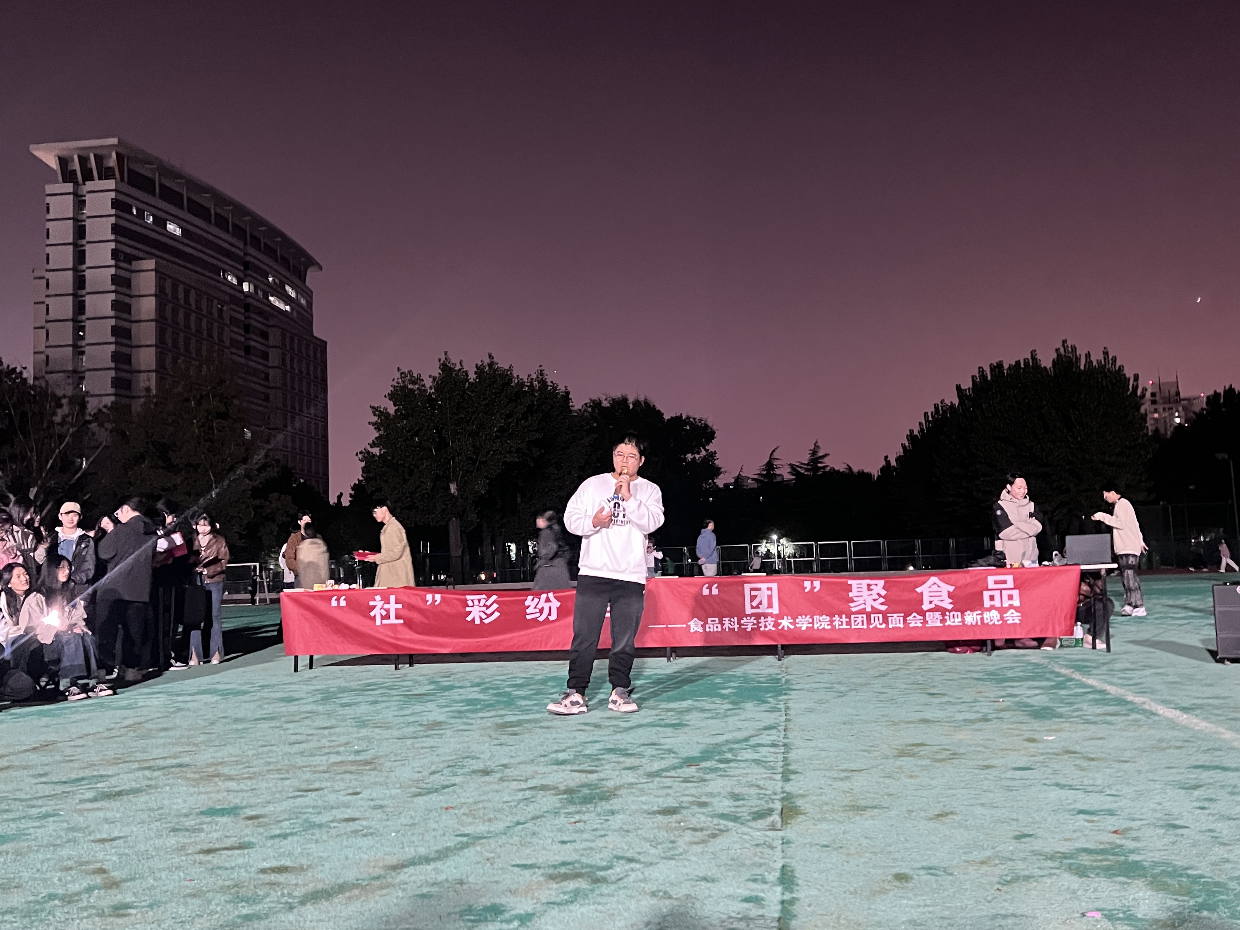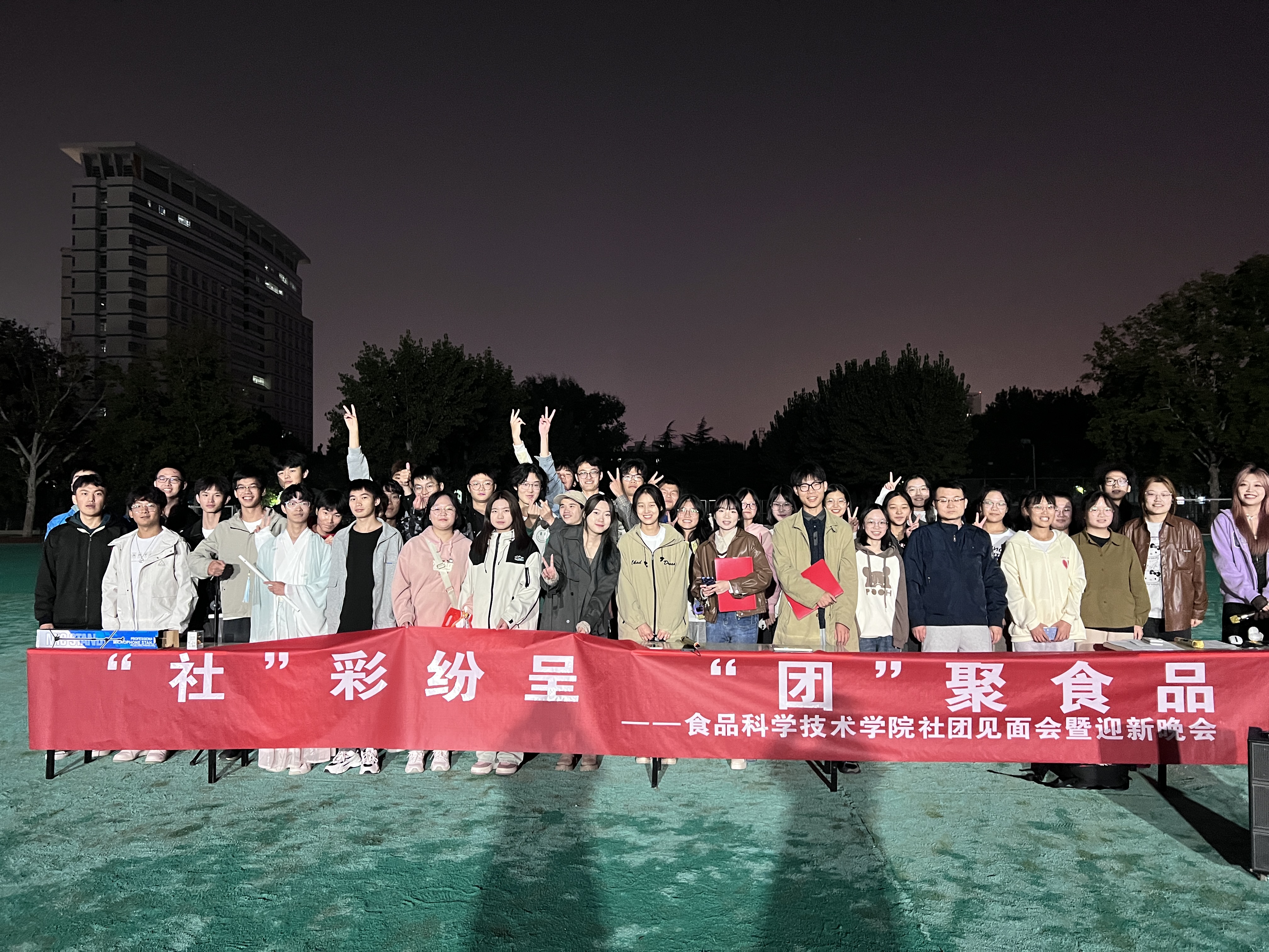 于10月20日晚19:00在文化路校区西操场举办了主题为“‘社’彩纷呈,‘团’聚食品”社团见面会暨迎新晚会,辅导员陈翔老师,23级全体同学,21、22级部分同学及各社团负责人及成员参加活动。