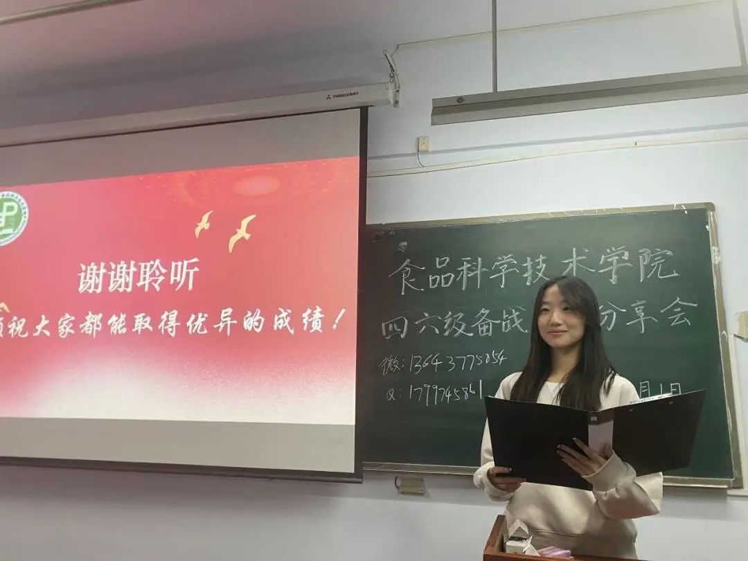 万俊莲根据自己备考四六级的经验,从听力、选词填空、写作等方面,向同学们详细地讲解了一些典型的四六级例题,同时,她向同学们分享了自己总结的写作模板,并留下了联系方式,她表示,同学们若有问题皆可向她咨询。