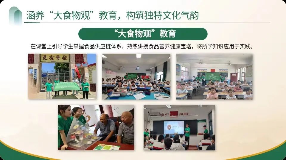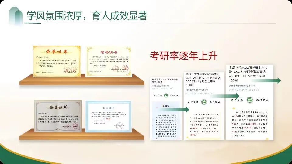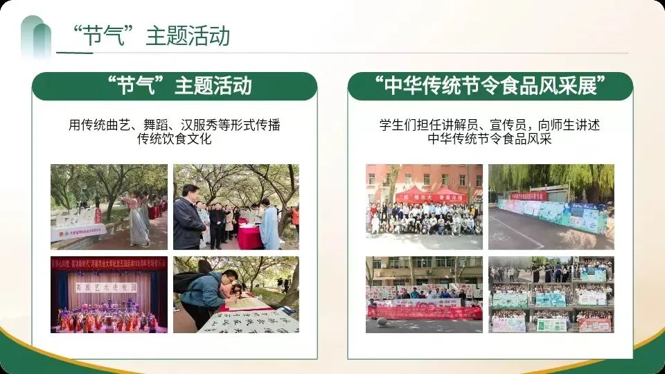 学院课程积极融入“大食物观”教育,在课堂上引导学生掌握食品供应链体系,熟练讲授食品营养健康宝塔,讲所学知识应用于实践。举办以“节气”为主题的饮食文化活动,用传统曲艺、舞蹈、汉服秀等形式传播传统饮食文化,举办“中华传统节令食品风采展”主题科普活动,学生们担任讲解员、宣传员,向师生讲述中华传统节令食品风采。将党的二十大报告提出的“树立大食物观”“构建多元化食物供给体系”不断落细、落小、落实。以多种形式构建浸润式“大食物观”文化育人模式形成“以文化人”实践教学模式。学院学风氛围浓厚,育人成效显著,近年来学院考研率连年升高,达到60%以上。该模式荣获全省高校思想政治工作优秀品牌等荣誉。